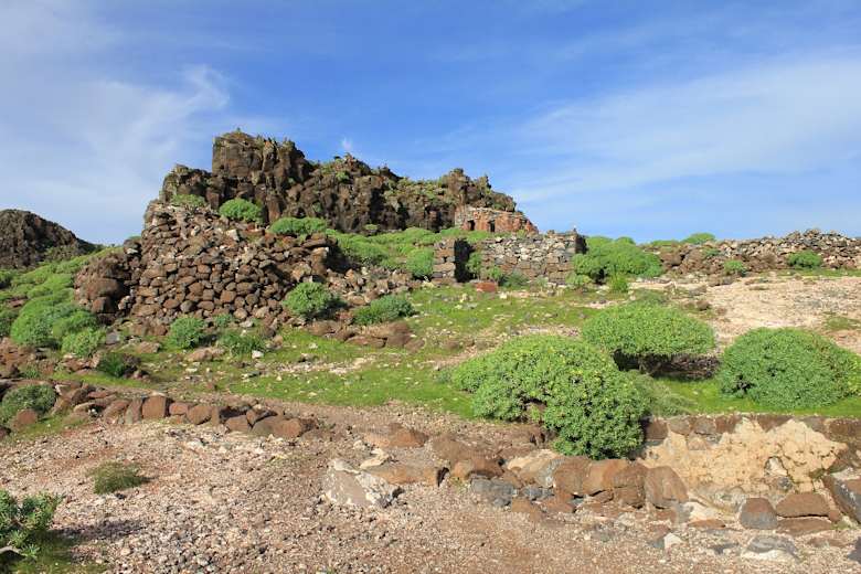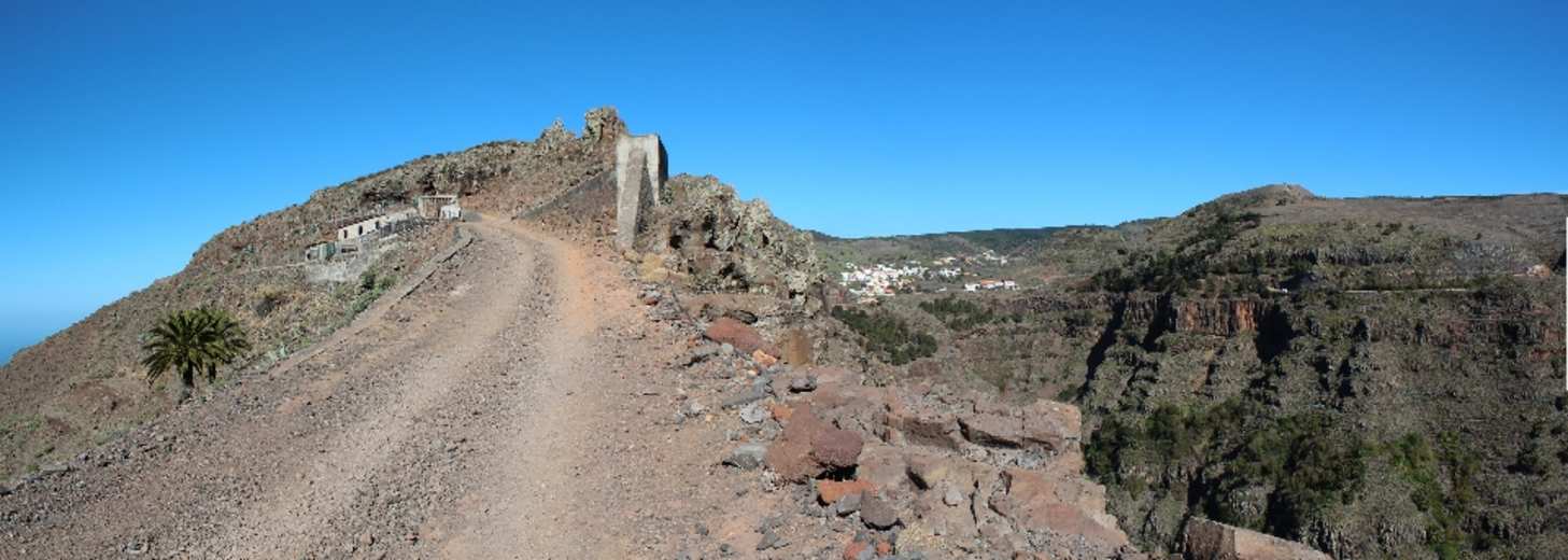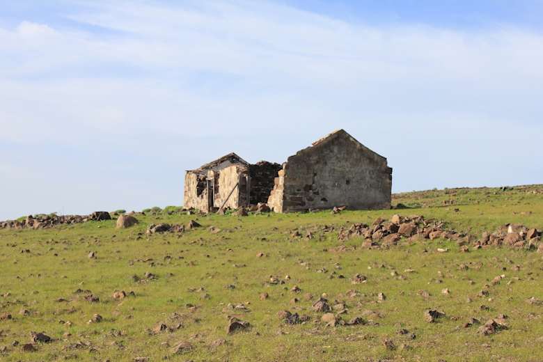Wieder zurück am weiß-rot markierten Hauptweg, passieren wir nach 5 Minuten ein allein stehendes, verfallenes Haus und einen alten, kreisrunden Dreschplatz. Der Weg steigt weiter über die sanft geneigte, terrassierte Hochfläche an und erreicht nach einer Viertelstunde eine Zisterne und ein weiteres verfallenes Haus an einer Felsengruppe. 5 Minuten später zweigt links ein Pfad zur Vermessungssäule auf dem Gipfel La Mérica ab.