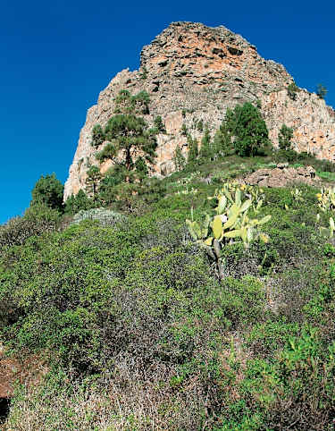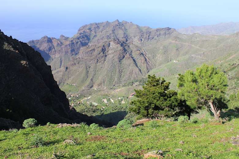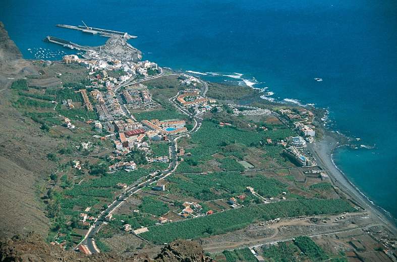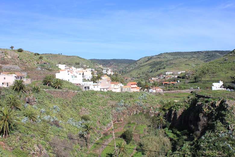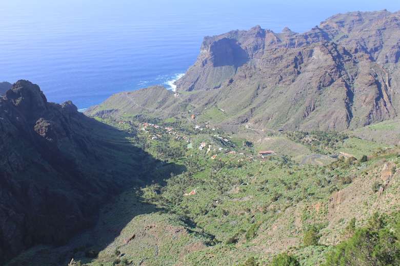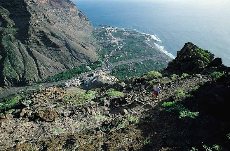 Er führt in bequemen Serpentinen bergan und vermittelt einen immer umfassenderen Überblick über das Valle Gran Rey. Nach insgesamt einer guten halben Stunde mündet von links ein ebenfalls von La Calera kommender Weg ein – der Camino wird nun etwas steiler, die Landschaft zunehmend felsiger. Eine gute Viertelstunde später zweigt an einer Basaltwand links ein deutlicher Pfad ab, der uns zu einem Aussichtsplatz mit Blick über das Mündungsdelta des Barranco del Valle Gran Rey bringt.