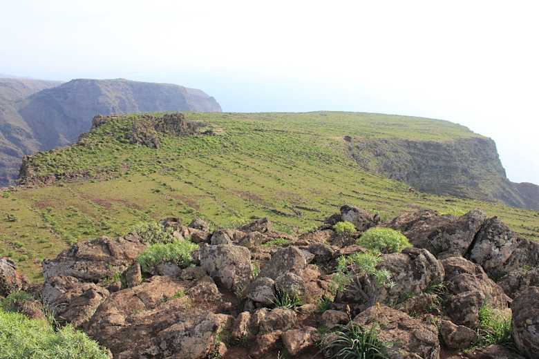 Während des hin und wieder etwas eintönigen, aber gemütlichen Weiterweges über den lang gestreckten Höhenzug genießen wir außerdem grandiose Ausblicke zur Steilküste und auf das Tal von Taguluche.