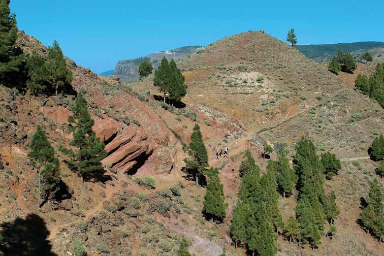 Nach dem Gipfel-Abstecher folgt der vielleicht schönste Abschnitt des Weges: Er führt auf der rechten Kammseite durch Felsen und vorbei an Höhlen (Ziegenställe) in eine rötliche Erosionslandschaft, in der wir eine schwarze Lavamauer passieren. Nach 20 Minuten wendet sich der Camino der linken Kammseite zu, kehrt aber gleich wieder zur rechten Kammseite zurück und führt dort an einem Ziegengehege vorbei.