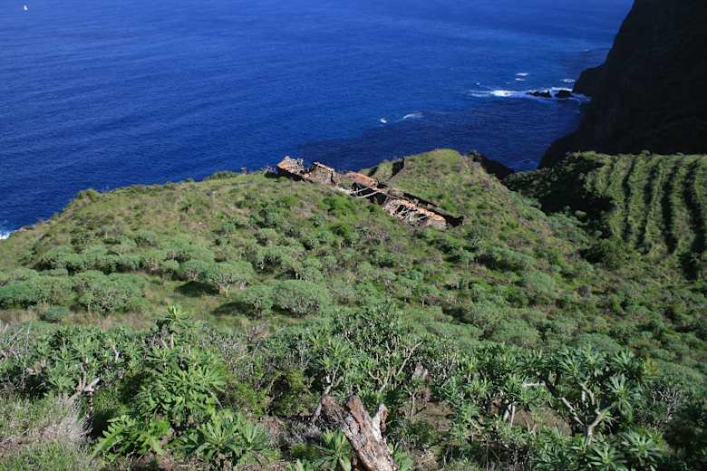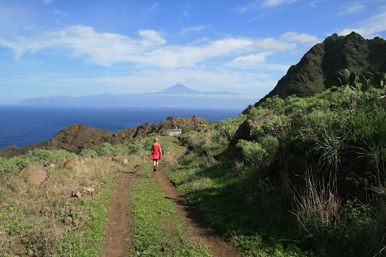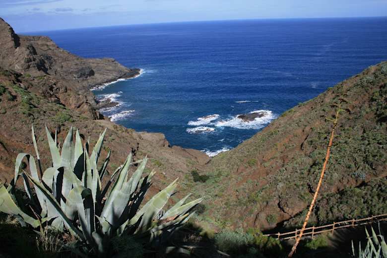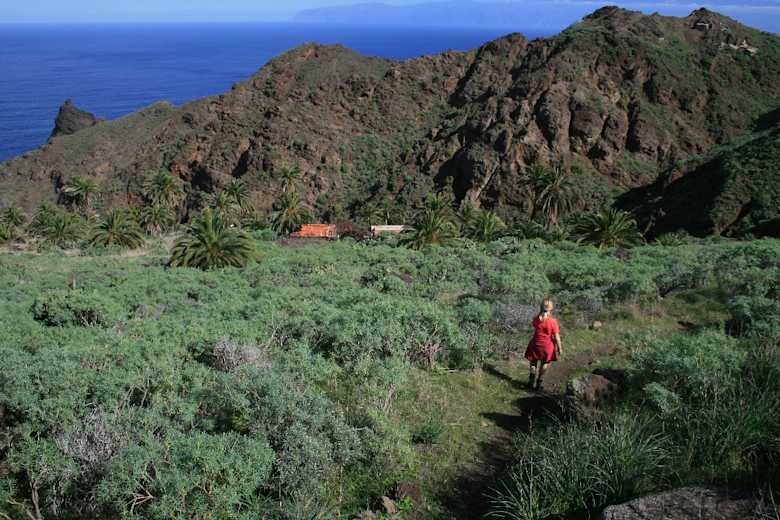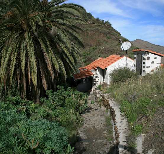 Auf der Piste nach links, an der Gabelung nach 3 Minuten abermals links und vorbei an einem allein stehenden Gehöft hinab zu den bereits sichtbaren Casas del Palmar. 30 m nach dem ersten Haus zweigt der markierte Wanderweg links ab auf einen Pfad (geradeaus über die Piste gelangt man in den abgeschiedenen, verlassenen Weiler Tagaluche, der in einem grandiosen Talkessel am Fuß der Enchereda-Kette und oberhalb der Steilküste liegt; ¼ Std. einfach).