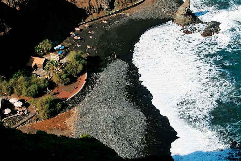 Schließlich geht es mit luftigem Tiefblick auf die Playa de La Caleta links hinüber zur Straße, die links zurückführt nach Hermigua – rechts sind es 10 Minuten zur Playa de La Caleta (Restaurant, Picknickplatz).