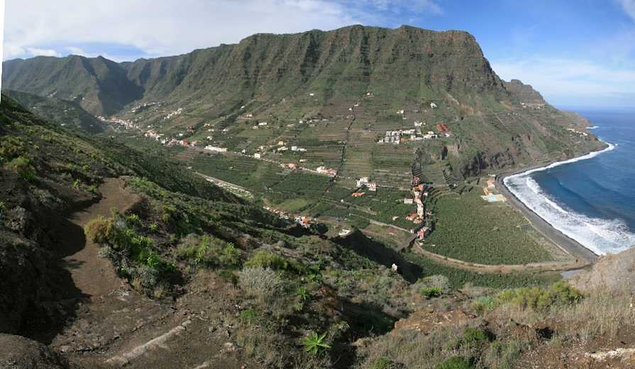 Von der Kirche in Hermigua gehen wir etwa 500 m die Hauptstraße hinab, vorbei an der Casa Creativa, und biegen 20 m vor der Cepsa-Tankstelle rechts auf einen breiten Treppenweg ab. Er führt hinab in den Barranco de Monteforte, überquert das Bachbett und mündet in einen Querweg, den wir nach rechts verfolgen. Schon bald lassen wir den Barranco mit seinen Bananenplantagen wieder hinter uns und steigen über eine Treppe links haltend zur Straße auf der anderen Talseite hinauf.
