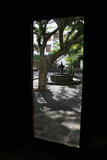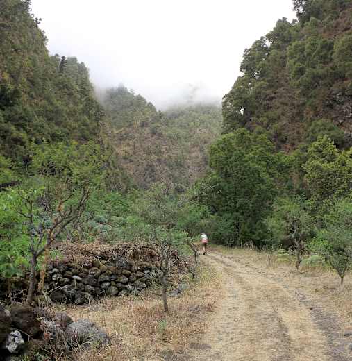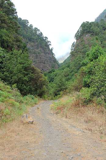 Auf der Rückseite der sehenswerten Kirche bringt uns ein breiter Treppenweg (PR LP 2.3, weiß-gelb) hinab zur Zufahrtsstraße, die nach 100 m auf die Hauptstraße LP-101 trifft. Wir gehen gegenüber auf der Straße neben dem Parkplatz weiter. Sie geht sogleich in einen Betonweg über, der nach 5 Minuten in einen Fahrweg einmündet. Auf diesem weiter talaufwärts im Barranco de la Madera.