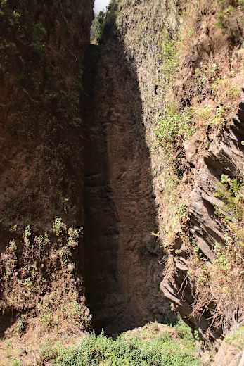Einige Minuten später, 50 m nach der Galería El Torbellino, wechselt der Weg auf die rechte Talseite. Wer nicht trittsicher und schwindelfrei ist sollte hier besser umkehren, denn der Weg wird nun etwas anspruchsvoller und mühsamer. Er steigt stellenweise schmal und abschüssig über dem Talgrund an und erreicht nach etwa 20 Minuten in ca. 900 m Höhe den Talschluss am Fuß eines etwa 30 m hohen, senkrechten Katarakts.