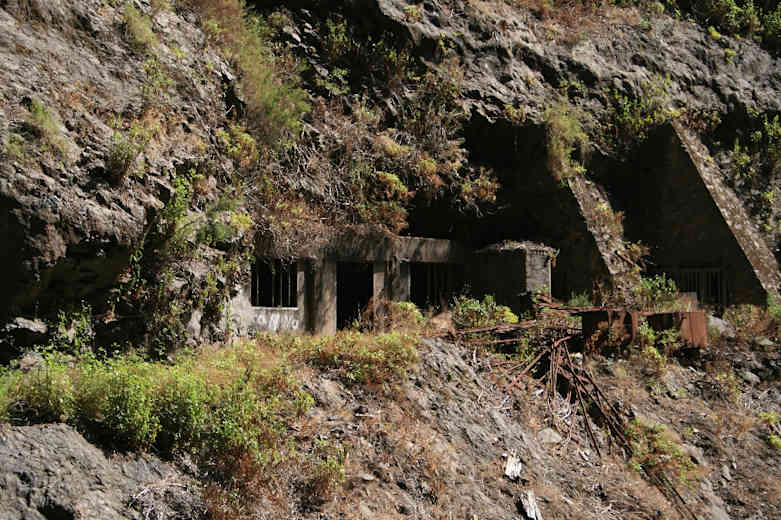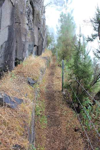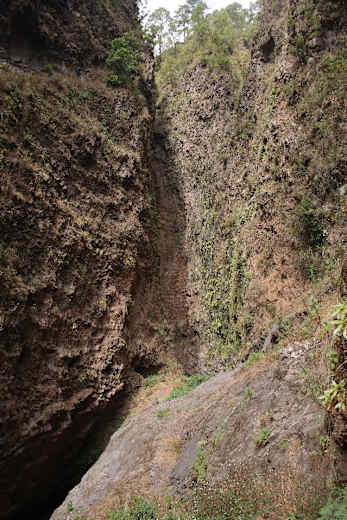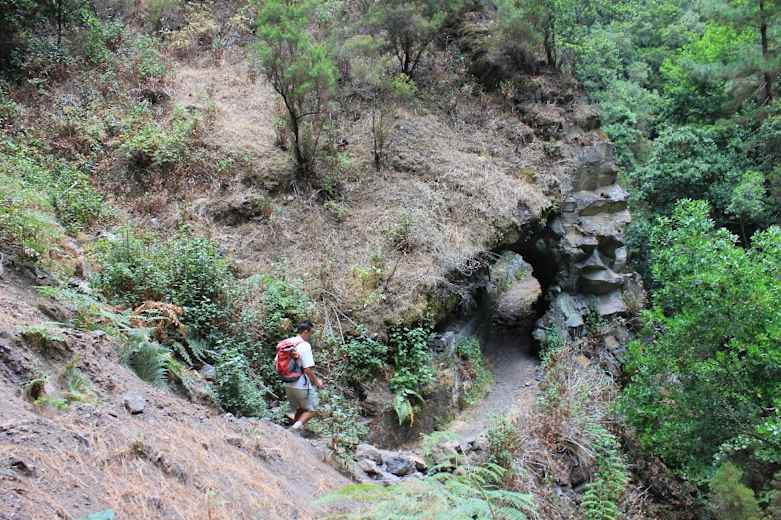Entlang einem Wasserkanal setzt sich ein Pfad fort, der nun kurzzeitig in Nebelwald eintritt und beständig oberhalb dem tief eingeschürften Bachbett ansteigt. Nach einer knappen Viertelstunde folgt ein eindrucksvolles Wegstück in der von himmelhohen Wänden eingefassten Schlucht: Wir kommen unter einem Felsüberhang hindurch, 10 Minuten danach durch ein kleines Felstor.