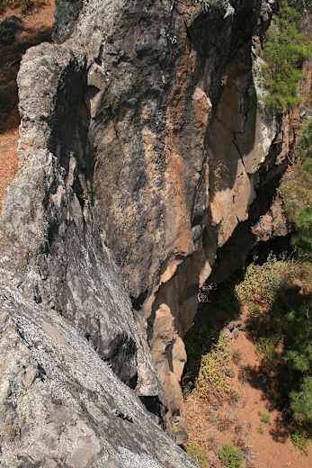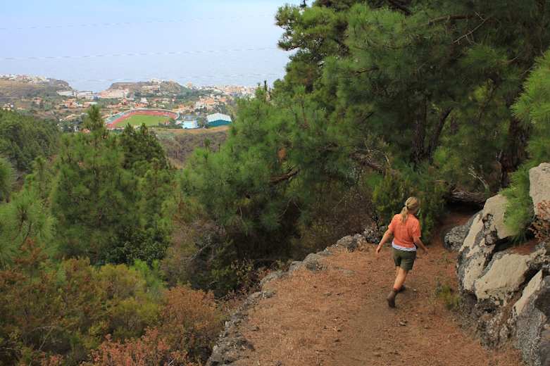 In der Folge zieht der markierte Wanderweg immer über den von lichten Kiefernwäldern überzogenen Kamm hinab – zunächst links der Kammhöhe, nach 5 Minuten dann auf der rechten Kammseite hoch über dem Barranco del Río, mit schönem Blick zur Punta de los Roques und zum Pico Corralejo, später nach Las Breñas und schließlich auch nach Santa Cruz. Nach einer halben Stunde verläuft der schöne Camino wieder auf bzw. nahe der Kammhöhe.