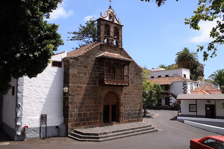 Auf dieser passieren wir nach 10 Minuten einen Hochspannungsmast. 10 Minuten später kommen wir an einer links zum Barranco de la Madera hin abfallenden 20-Meter-Felswand vorbei, in der man manchmal Kletterer beobachten kann. Einige Minuten später passieren wir eine Villa mit Palmengarten. Danach halten wir uns auf der Hochfläche rechts und steigen auf dem markierten Weg in 10 Minuten hinab zur Wallfahrtskirche Las Nieves.