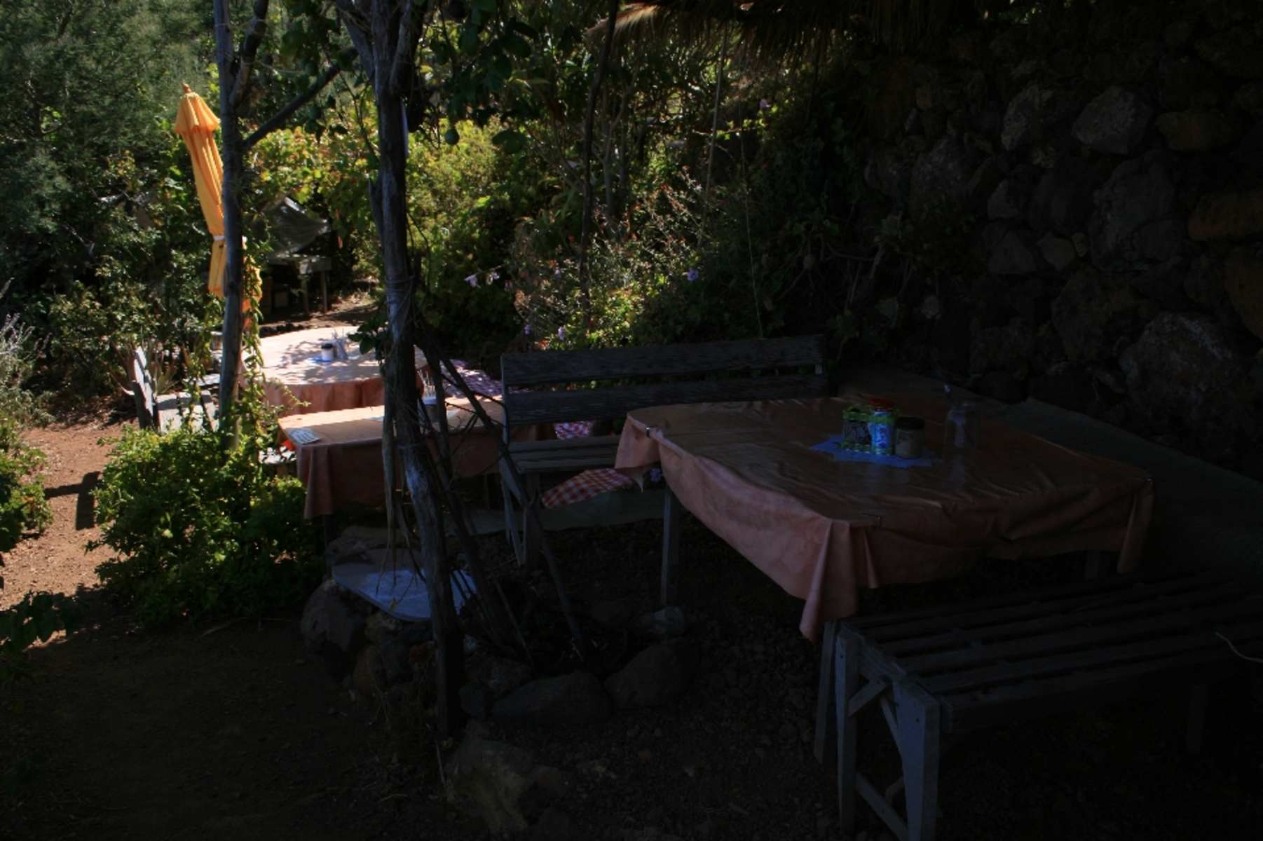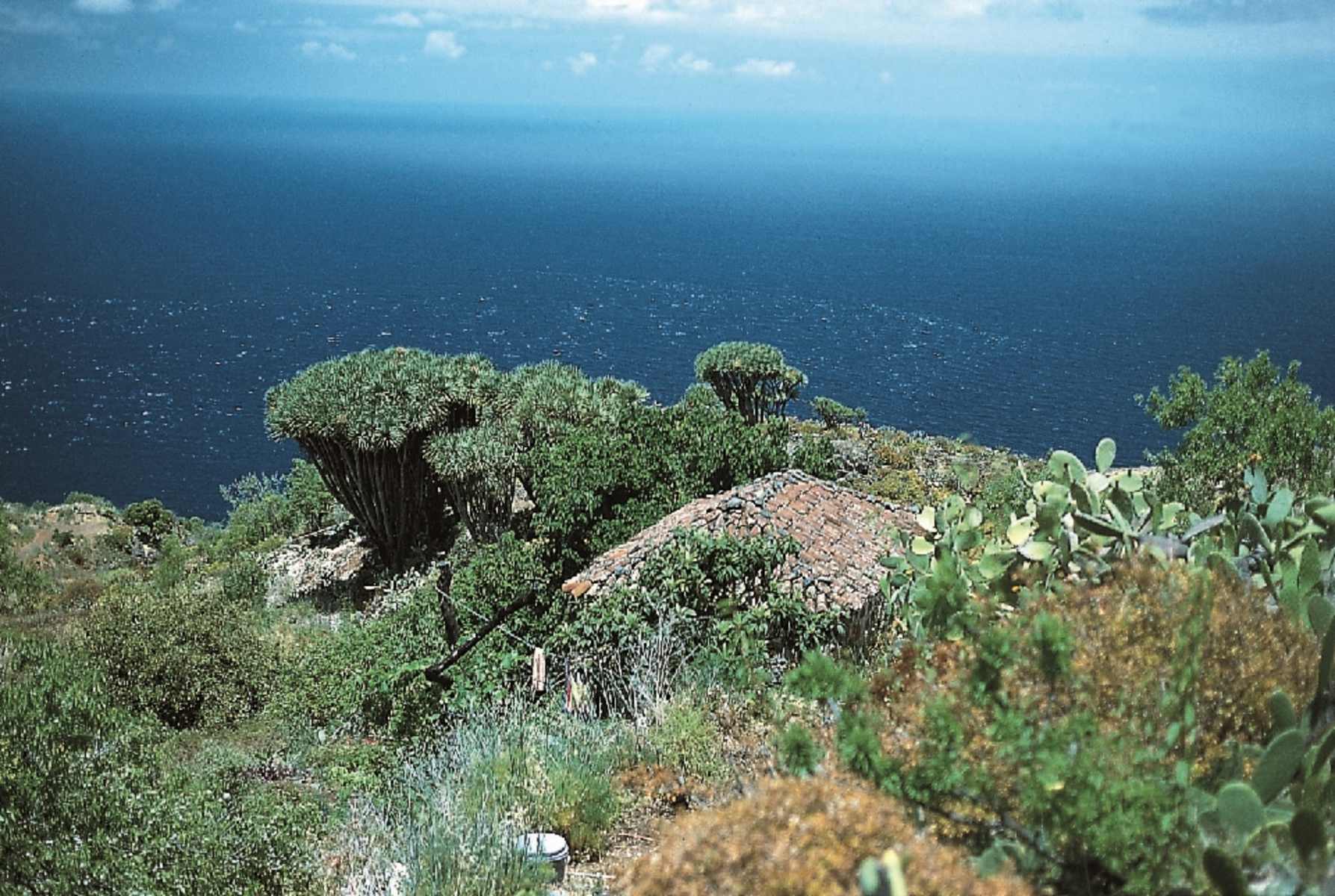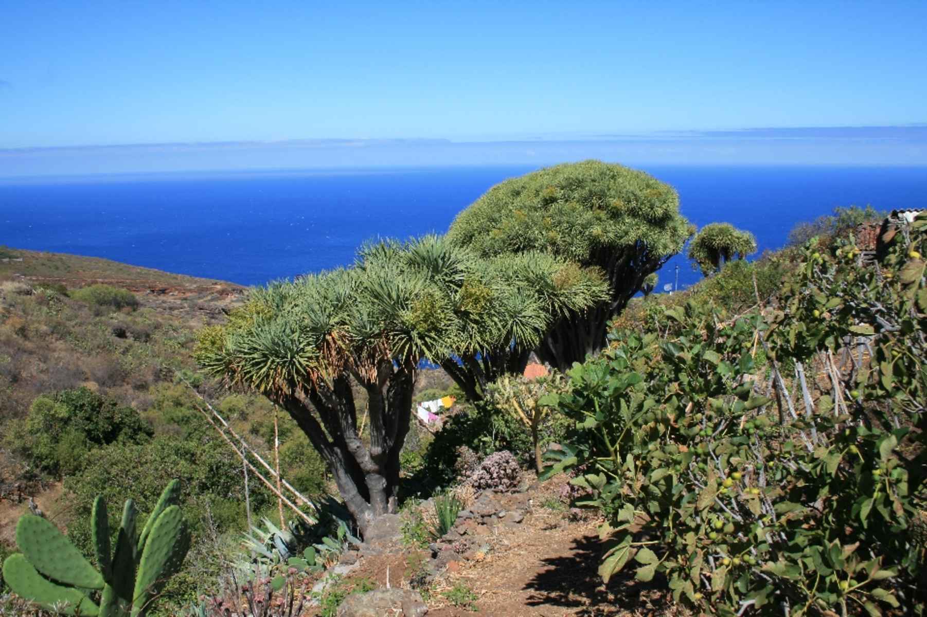 Nach knapp 15 Minuten verzweigt sie sich 10 m vor einem Wasserreservoir – hier halb rechts weiter zu den Drachenbäumen im Talgrund, zwischen denen ein schöner Pfad weiterführt. An der nächsten Verzweigung halten wir uns links bergab (weiß-rot durchgestrichen) und sogleich wieder auf dem Pfad nach rechts (anschließend beim Café Finca Aloe geradeaus). Er bringt uns in wenigen Minuten zu den Cuevas de Buracas, 400 m.
