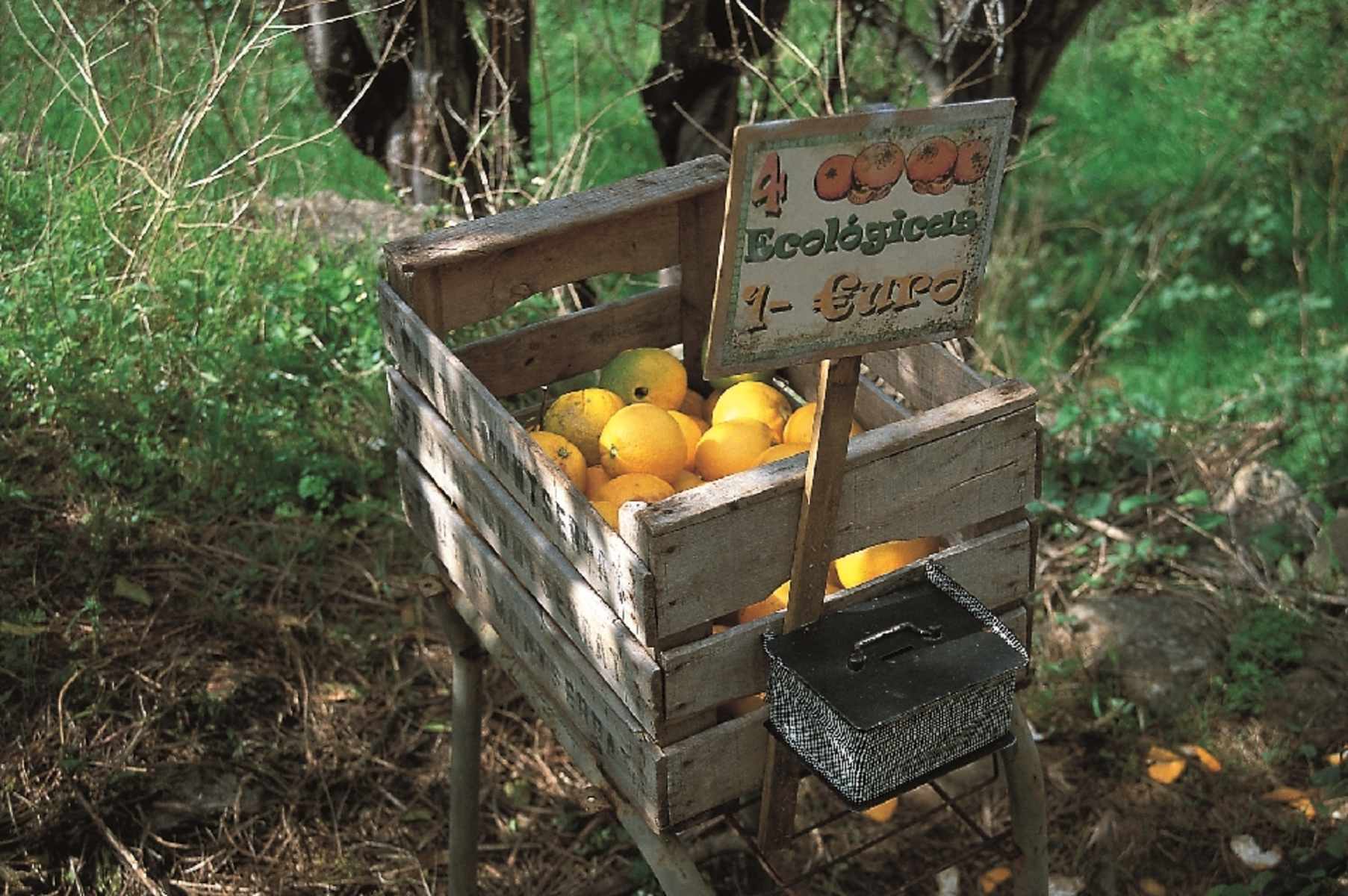 10 m vor der Kirche zweigt von der Hauptstraße links abwärts ein Betonsträßchen ab (Infotafel), von dem nach 40 m links ein Camino zum nächsten Bergrücken hinüberführt. Über diesen wandern wir gemütlich hinab, vorbei an hübschen Häuschen und Gärten. Nach 5 Minuten erreichen wir eine Wegkreuzung – hier rechts mit dem GR 130 (weiß-rot) hinüber zur nahen Hauptstraße und auf dieser weiter hinab. Nach 5 Minuten, 50 m nach der Straßenverengung, zweigt in der scharfen Rechtskurve geradeaus der GR 130 auf einen breiten Pflasterweg ab (nach 100 m links, gleich darauf rechts auf breitem Pfad "R.T. Traviesa").