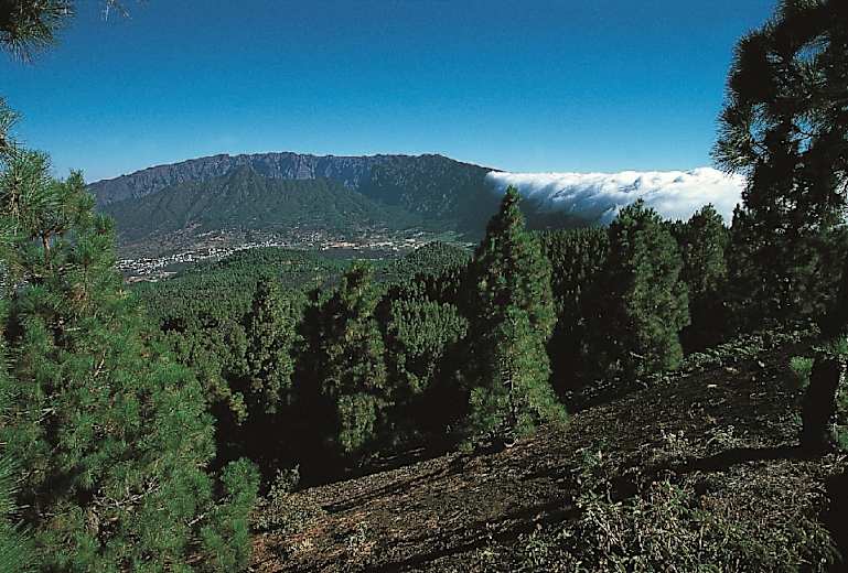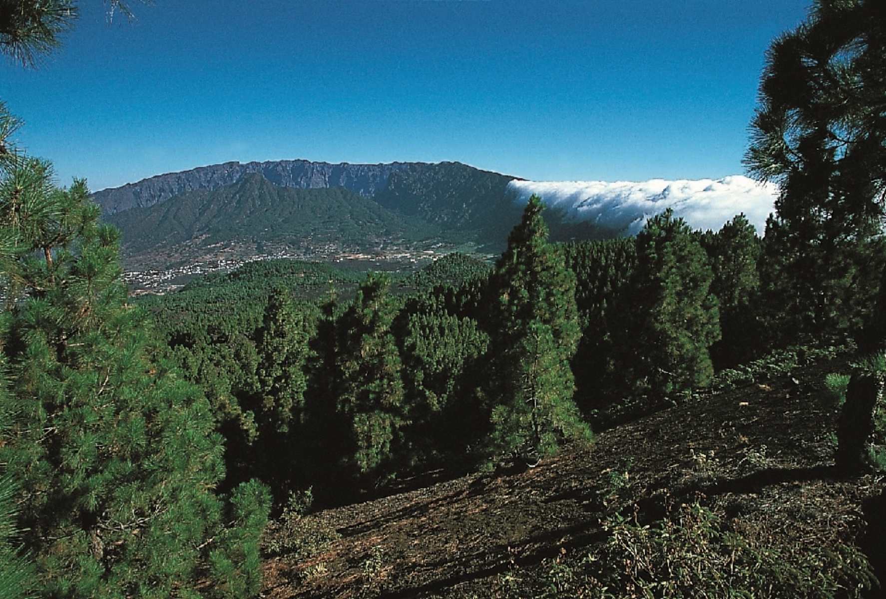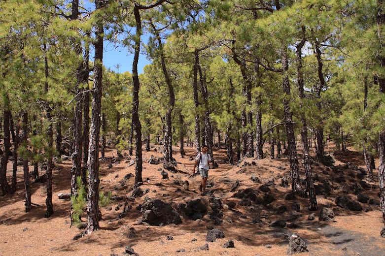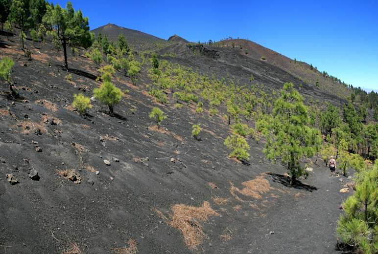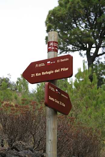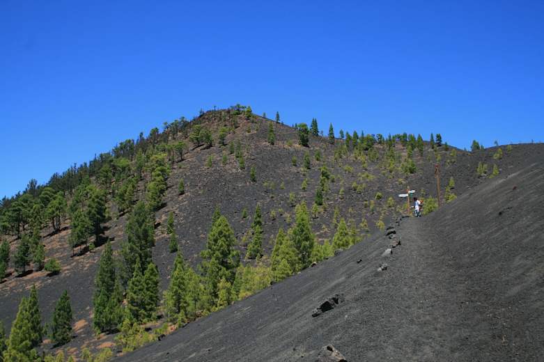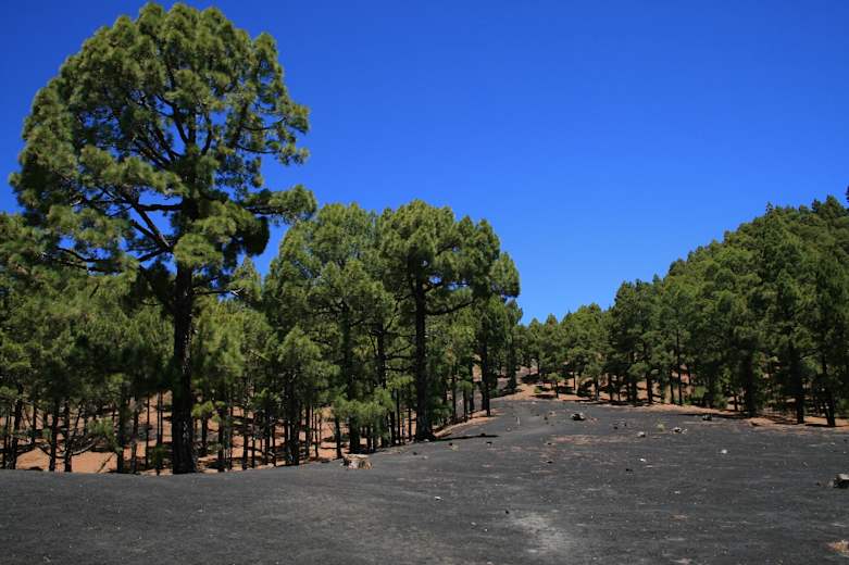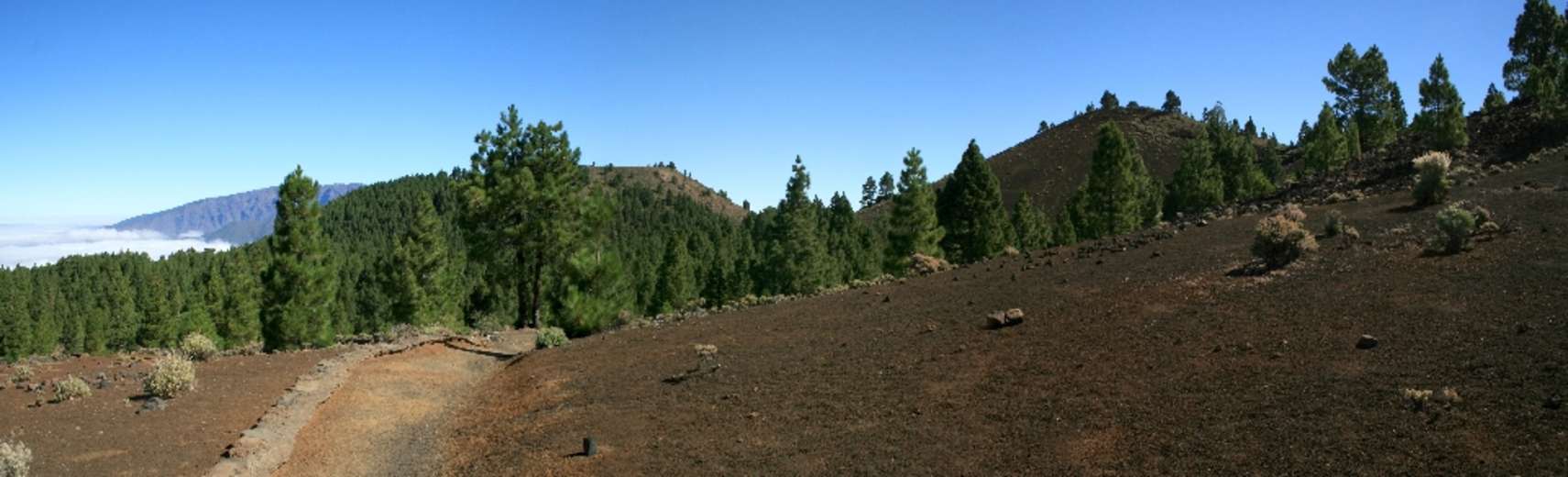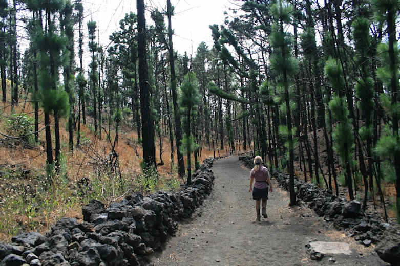 Von der Straße gehen wir durch das Picknickgelände zum Refugio del Pilar und halten uns 50 m nach dem Besucherzentrum (interessante Ausstellung zur Cumbre Vieja) an der Gabelung rechts in Richtung "Los Canarios" (GR 131, weiß-rot). Nach 10 Minuten halten wir uns an der Gabelung abermals rechts. Der Wanderweg verläuft zunächst durch herrlichen Kiefernwald, später öffnet sich der Blick auf die Bergumrahmung der Caldera de Taburiente und auf das Aridane-Tal. Wir queren nun die Lavagrus-Flanke des Pico Birigoyo – nur Farne, Ginsterbüsche und Kiefern lockern das vom schwarzen Sand geprägte Landschaftsbild.