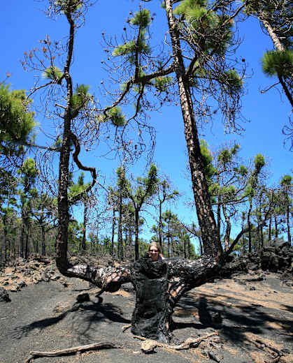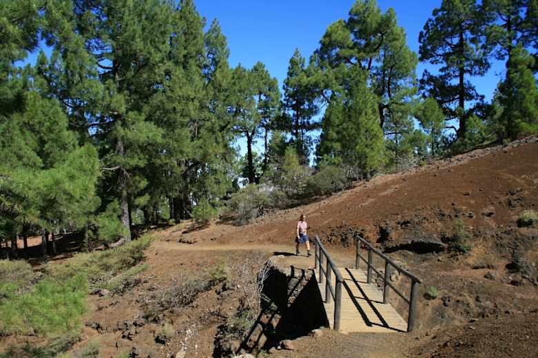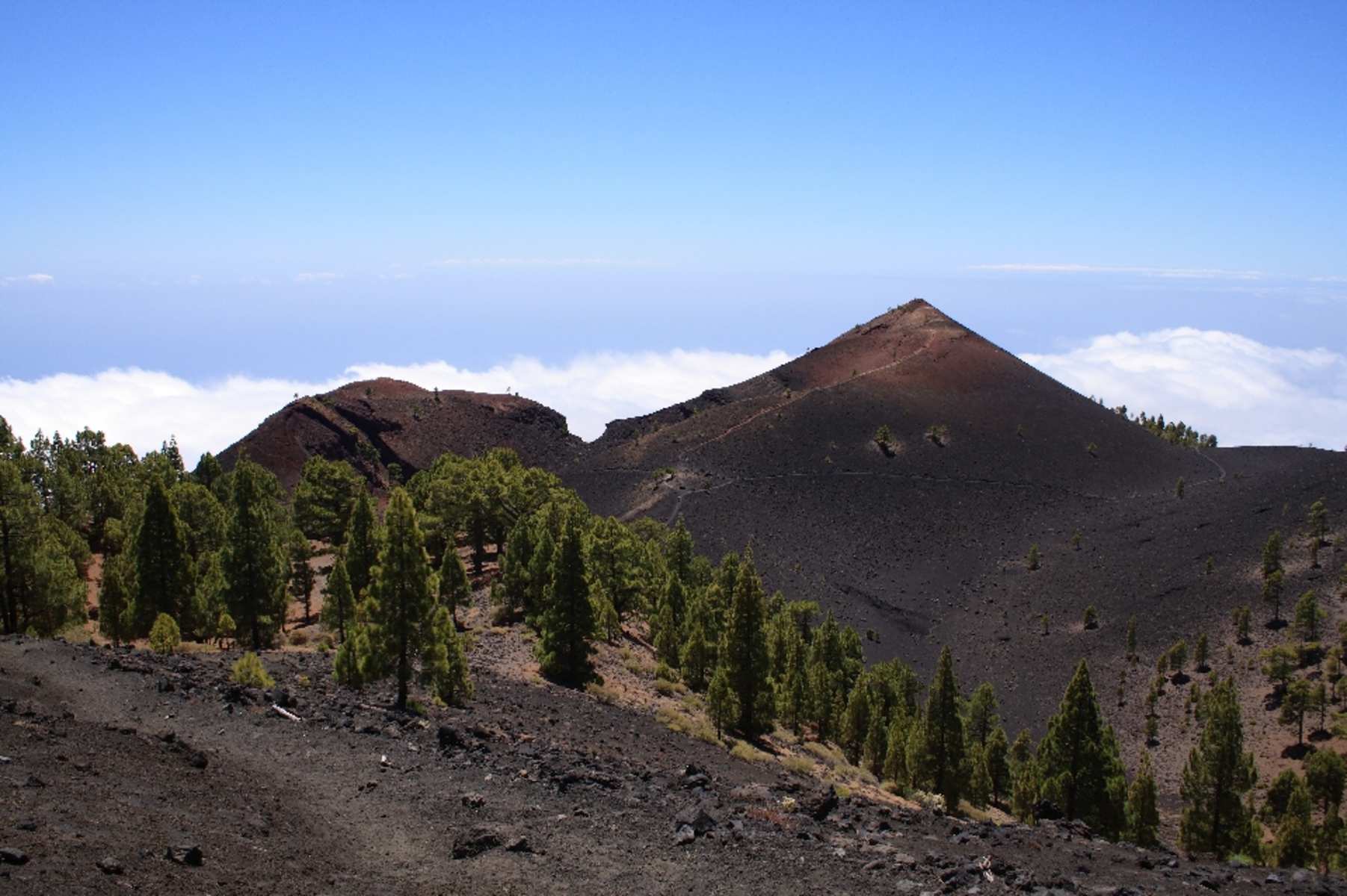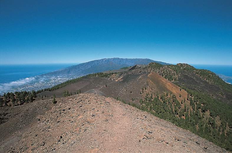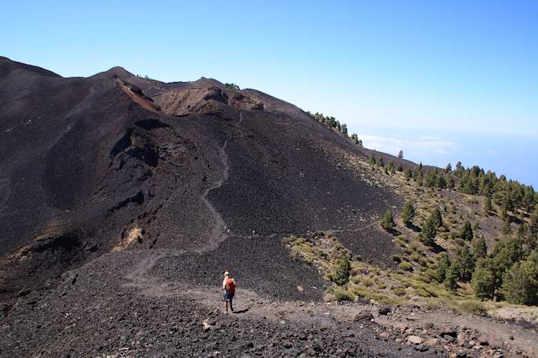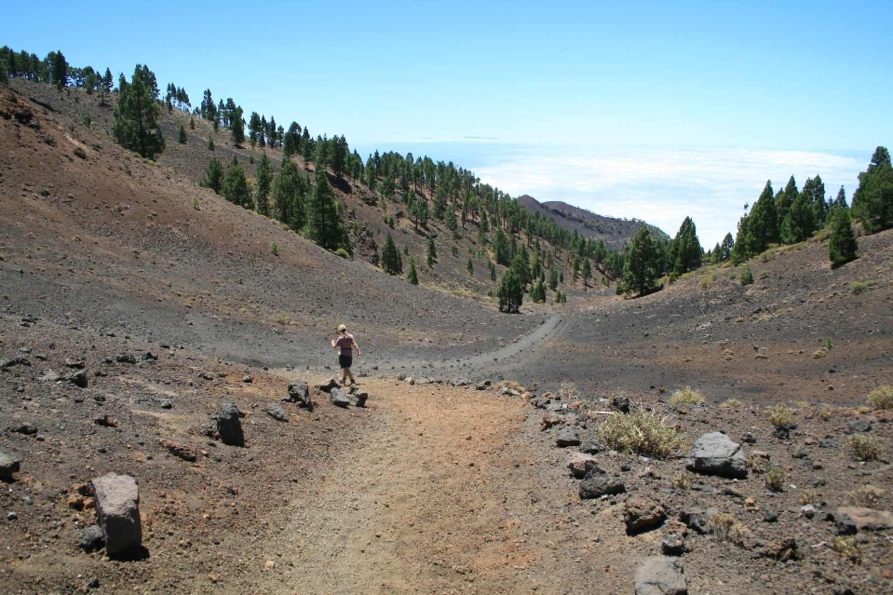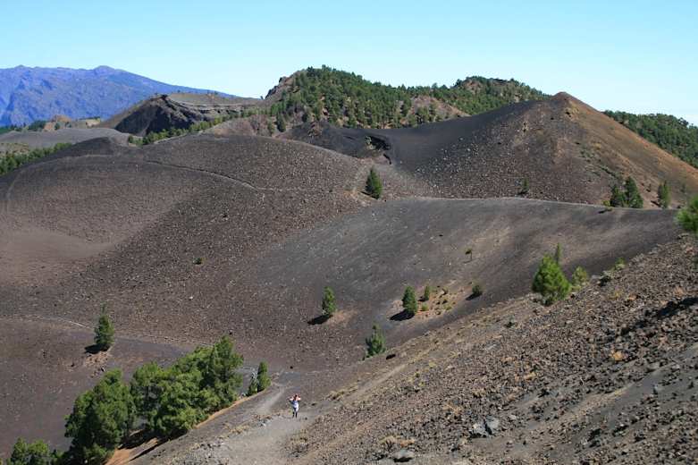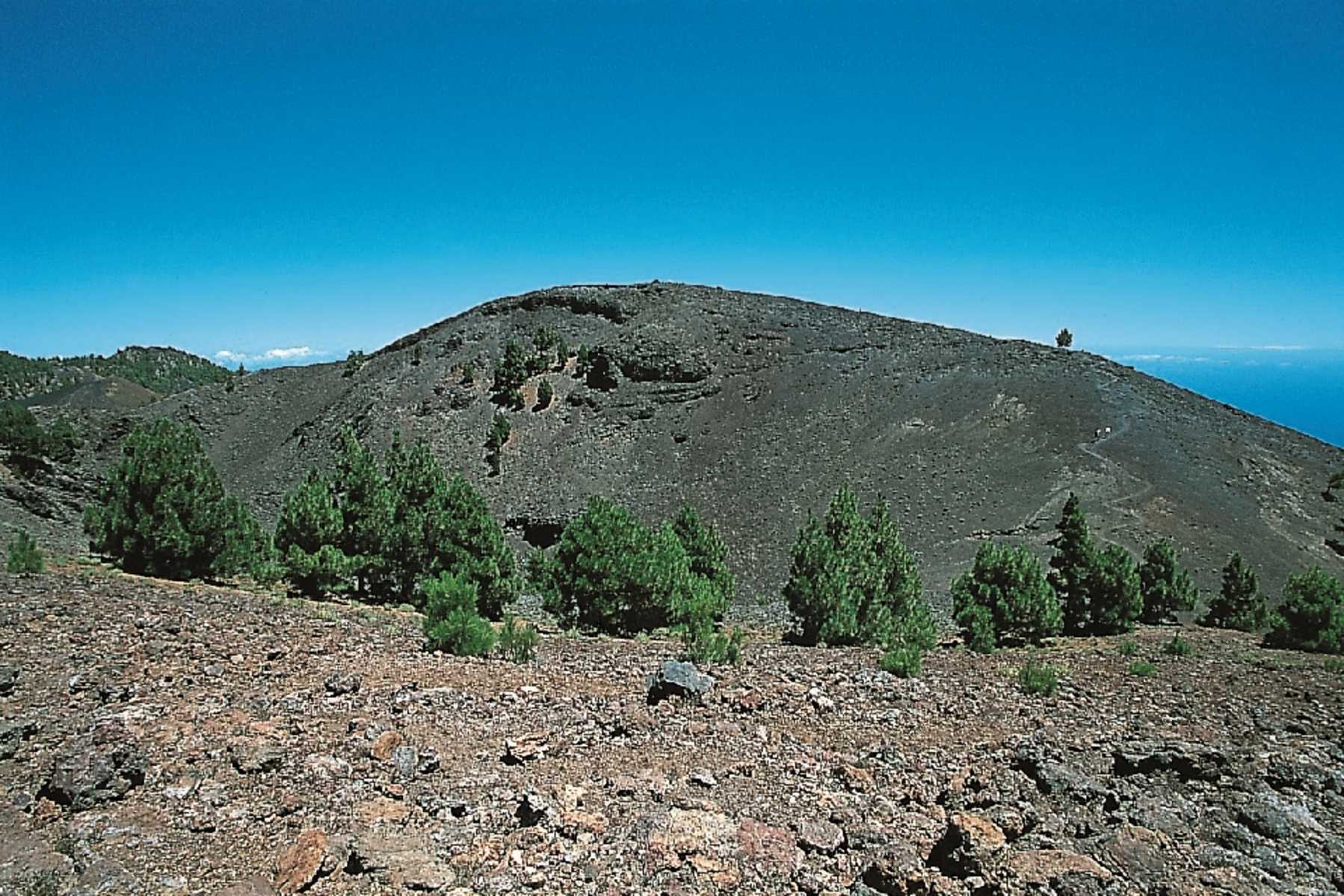 Von der Straße gehen wir durch das Picknickgelände zum Refugio del Pilar und halten uns 50 m nach dem Besucherzentrum (interessante Ausstellung zur Cumbre Vieja) an der Gabelung rechts in Richtung "Los Canarios" (GR 131, weiß-rot). Nach 10 Minuten halten wir uns an der Gabelung abermals rechts. Der Wanderweg verläuft zunächst durch herrlichen Kiefernwald, später öffnet sich der Blick auf die Bergumrahmung der Caldera de Taburiente und auf das Aridane-Tal. Wir queren nun die Lavagrus-Flanke des Pico Birigoyo – nur Farne, Ginsterbüsche und Kiefern lockern das vom schwarzen Sand geprägte Landschaftsbild.