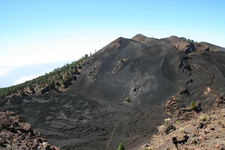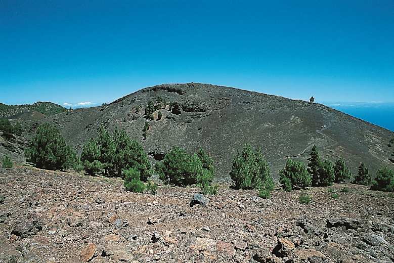 Über Lavagrushänge wandern wir nun immer direkt auf den bräunlichen Doppelgipfel der Montaña Pelada zu (nach 5 Min. zweigt rechts SL LP 111 ab), den die Vulkanroute nach links umgeht, mit schönem Blick auf die dem Martín südlich vorgelagerten Sekundärkrater. 25 Minuten ab dem Sattel verflacht sich der Weg in einem Kiefernwald, gleich darauf gabelt er sich. Die Vulkanroute knickt hier links ab und leitet steil hinab zum Lavastrom des Martín, an dessen rechtem Rand sie weiter talwärts führt. Schon bald nimmt uns ein breiter, ebener Weg auf, den wir aber bereits nach wenigen Minuten wieder nach links verlassen.