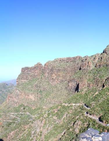 Tief unter uns erblicken wir die Westküste mit ihren Plantagen und den Treibhausdächern. Eine Brücke wird überquert (20 Min.), dann steigen wir entlang eines farbenprächtigen Erosionsgrabens hinauf zum Kamm und über diesen zum höchsten Punkt im Kammverlauf, 1.904 m (20 Min.; auf halber Strecke ignorieren wir den links abzweigenden Wanderweg SL LP 125, Tour "Pico Birigoyo – Pico Nambroque") – im Rückblick sehen wir auf Santa Cruz und Los Llanos. Anschließend wandern wir hinab an den Rand des tief eingeschnittenen, stark erodierenden Kessels des Cráter del Hoyo Negro.