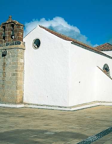 Unser Weg umgeht nun einen weiteren Berg nach rechts und mündet nach einigen Minuten in eine Pistenstraße. Dieser folgen wir nach links, um sie nach 5 Minuten wieder auf einem halb links abzweigenden Fahrweg zu verlassen. Unter uns taucht jetzt Los Canarios auf. Nach wenigen Minuten kreuzen wir nochmals links haltend die Straße, dann ist auch schon die Kirche und 100 m danach die Hauptstraße von Los Canarios (Fuencaliente) erreicht.