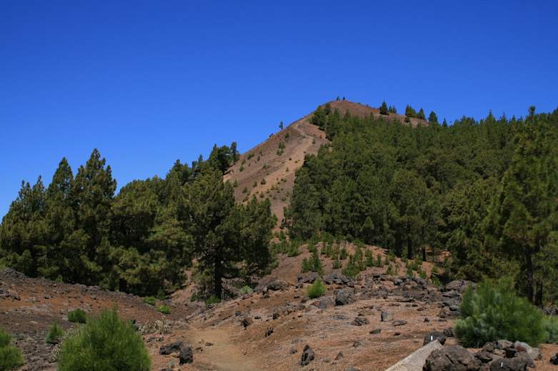 Es folgt ein lang gezogenes Tälchen, das zwischen mehreren Erhebungen hinabführt. Allmählich gesellen sich wieder vermehrt Kiefern an den Wegrand. Ein idyllisches Fleckchen, ganz besonders wenn die Codesobüsche blühen. Die Kiefern werden bald wieder rarer: Der Weg umgeht leicht ansteigend einen dunklen Vulkankegel (Caldera del Búcaro) nach links und führt hinaus zu einem flachen, nur schwach ausgeprägten Sattel (Mirador de Montaña Cabrito, 1.638 m; 40 Min.). Vor uns sehen wir nun bereits den Volcán Martín.