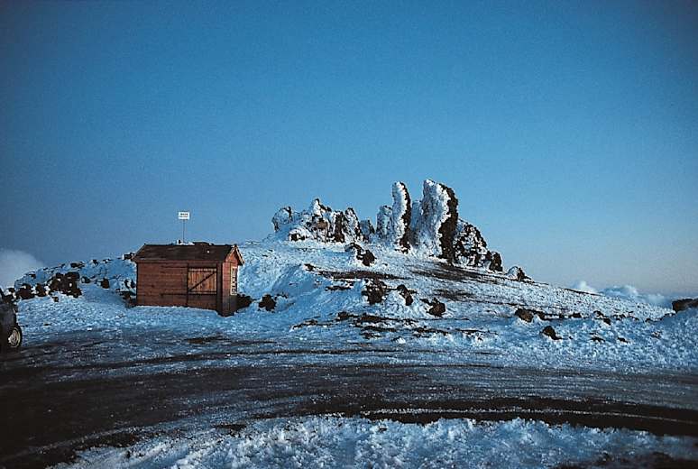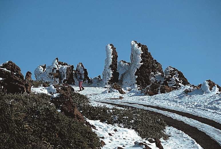 Wenige Minuten nur, dann ist auch schon der enge, geländergesicherte Aussichtsplatz auf dem Gipfel der Fuente Nueva, 2.366 m, erreicht. In der Ferne können wir die Nachbarinseln Teneriffa, La Gomera und El Hierro ausmachen. Eine gute halbe Stunde trennt uns nurmehr von der höchsten Erhebung der Insel. Kurzzeitig begleitet uns rechts eine Straße, dann geht es durch einen letzten Sattel hinauf zum Gipfel des Roque de los Muchachos, 2.426 m, den wir unmittelbar neben dem Info-Häuschen der Nationalparkverwaltung am Gipfelparkplatz erreichen (Wasserstelle).
