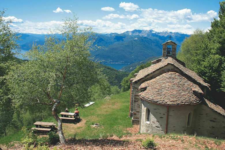 Wir wandern am Rifugio Campiglio vorbei − Abzweigungen nach rechts zum Monte Lema ignorieren wir − und bleiben auf dem breiten Weg 3V (Ww. »Alpone«), der durch herrlichen Buchenwald führt. Der Weg verläuft meist eben. Nach 50 Min. halten wir uns bei einer Abzweigung links (Ww. »Le Gemelle«) und erreichen nach 15 Min. dieCappella Madonna della Guardia. Das kleine Plateau mit der Kapelle ist ein schöner Rastplatz. Nur 5 Min. entfernt liegt das Almdorf Alpone di Curiglia mit dem Agriturismo Le Gemelle.