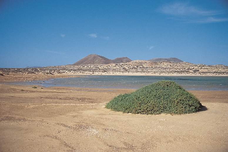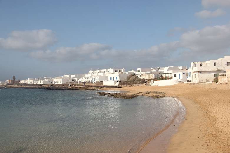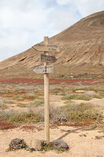 Vom Hafen Caleta del Sebo gehen wir auf der Mole an zwei Lokalen und der kleinen Inselbäckerei vorbei zu dem winzigen Dorfstrand und weiter an der Wasserlinie am Hafenbecken nach Süden. Vom Ortsrand bringt uns eine Sandpiste zur Bahía del Salado. An der weiten Bucht befindet sich eine Campingzone, bis auf die Sommermonate ist hier meist kaum etwas los. Der Weg hält direkt auf die Montaña Amarilla im Südwesten der Insel zu. An der Küste bildet sich bei Ebbe eine Flachwasserlagune, die durch einen schmalen Wasserarm mit dem Meer verbunden ist.