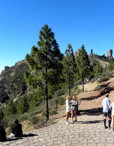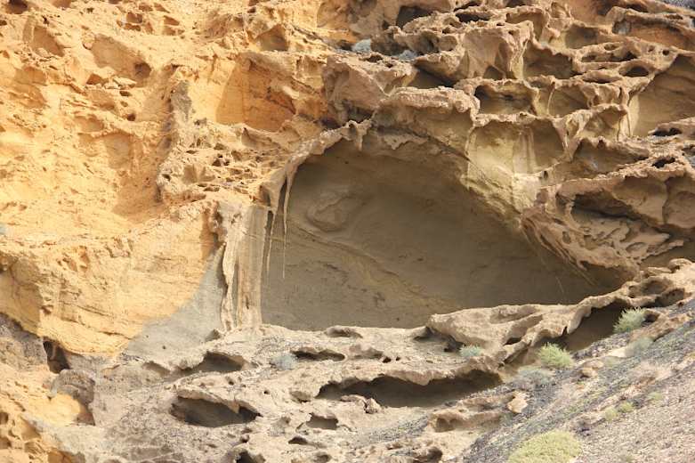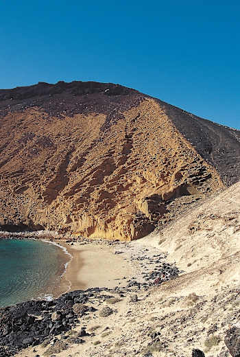 Hier wird offensichtlich, wie der "Gelbe Berg" zu seinem Namen kam – die Südwand ist kräftig ockergelb eingefärbt. Von der Playa de la Cocina steigen wir wieder zu einer Gabelung oberhalb vom Strand auf und gehen dort links und nach 15 m rechts (geradeaus kommt man zu einer Höhle). Der Pfad führt an der Ostflanke des Berges zu einer Gabelung auf einem Sattel, 80 m, hinauf. Von hier öffnet sich der Blick auf die Inseln Montaña Clara und Alegranza. Links zieht ein Pfad zum breiten Kraterrand hinauf.