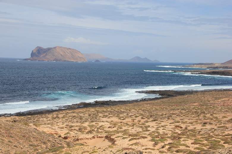 Wir steigen wieder zum "Sattel" ab. Dort nehmen wir links den Pfad, der in nördlicher Richtung auf die Küste zuhält. Als Orientierung dient der vorgelagerte felsige Klotz der Montaña Clara. Das letzte Stück hinab zum Meer verläuft etwas steiler über die Morros de las Carreras. Ein Querweg wird gekreuzt (rechts mögliche Abkürzung nach Caleta del Sebo). 100 m darauf treffen wir kurz vor der Westküste auf einen sandigen Fahrweg. Jenseits von diesem gibt es an der Caleta del Burro mit Lavasteinen aufgeschichtete Windschutzmauern, hinter denen man rasten und das Spiel der sich brechenden Wellen beobachten kann.