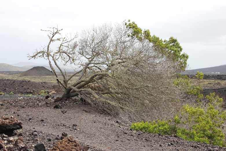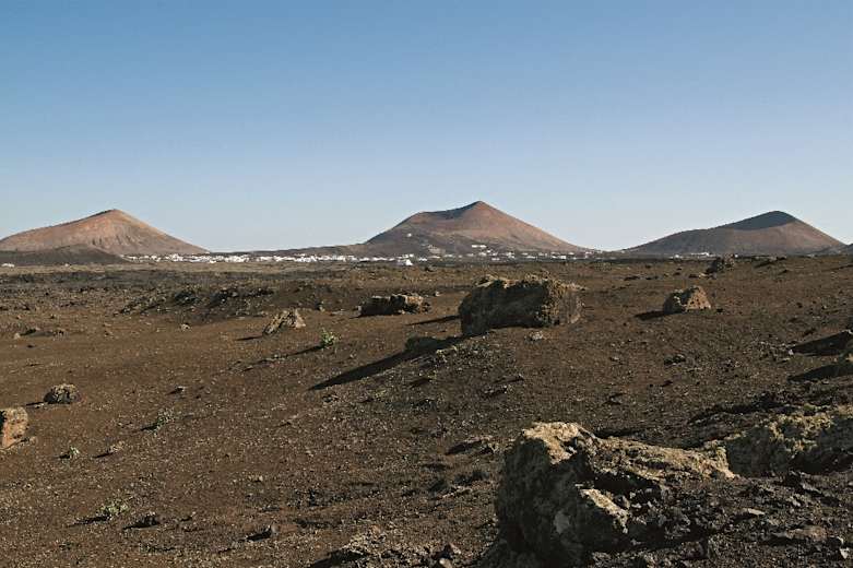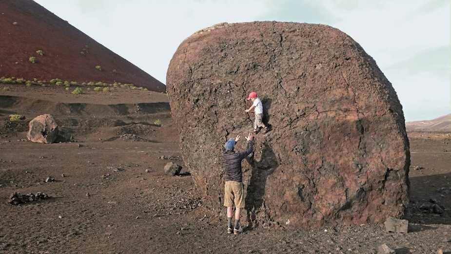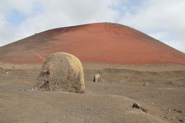Unser Weg hält zunächst auf die Montaña Negra zu, einen bereits vor mehreren Jahrtausenden entstandenen Vulkan, an dessen Fuß grüne Farbtupfer (Feigenbäume) auszumachen sind. Die Lavafelder am Wegrand sind teils stark von Flechten überzogen, als Pionierpflanzen bahnen sie der weiteren botanischen Entwicklung den Weg. An der Ostseite der Caldera Colorada zieht bald eine vulkanische Bombe (Bomba volcánica) die Blicke auf sich, der etwa 5 m hohe Brocken erhielt seine ovale Form durch die Rotationskräfte während des Auswurfs.