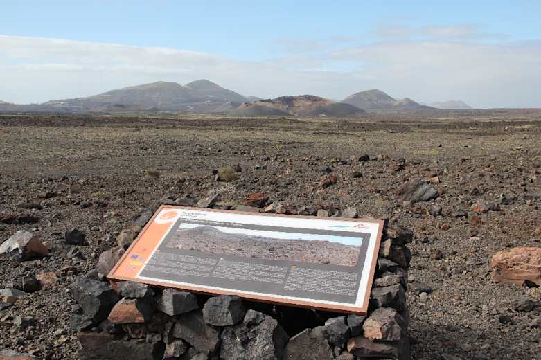 Vom Wanderparkplatz an der LZ-56 wird nach einer über den Weg gespannten Kette nach ein paar Schritten eine Tafel erreicht, die über den Rundweg informiert. An der Gabelung 100 m darauf gehen wir leicht rechts, wir starten die Umrundung der Caldera Colorada also entgegen dem Uhrzeigersinn. Eine weitere Infotafel macht auf die während der Eruptionen im 18. Jh. entstandene Caldera de los Cuervos aufmerksam (siehe Tour „Caldera de los Cuervos").
