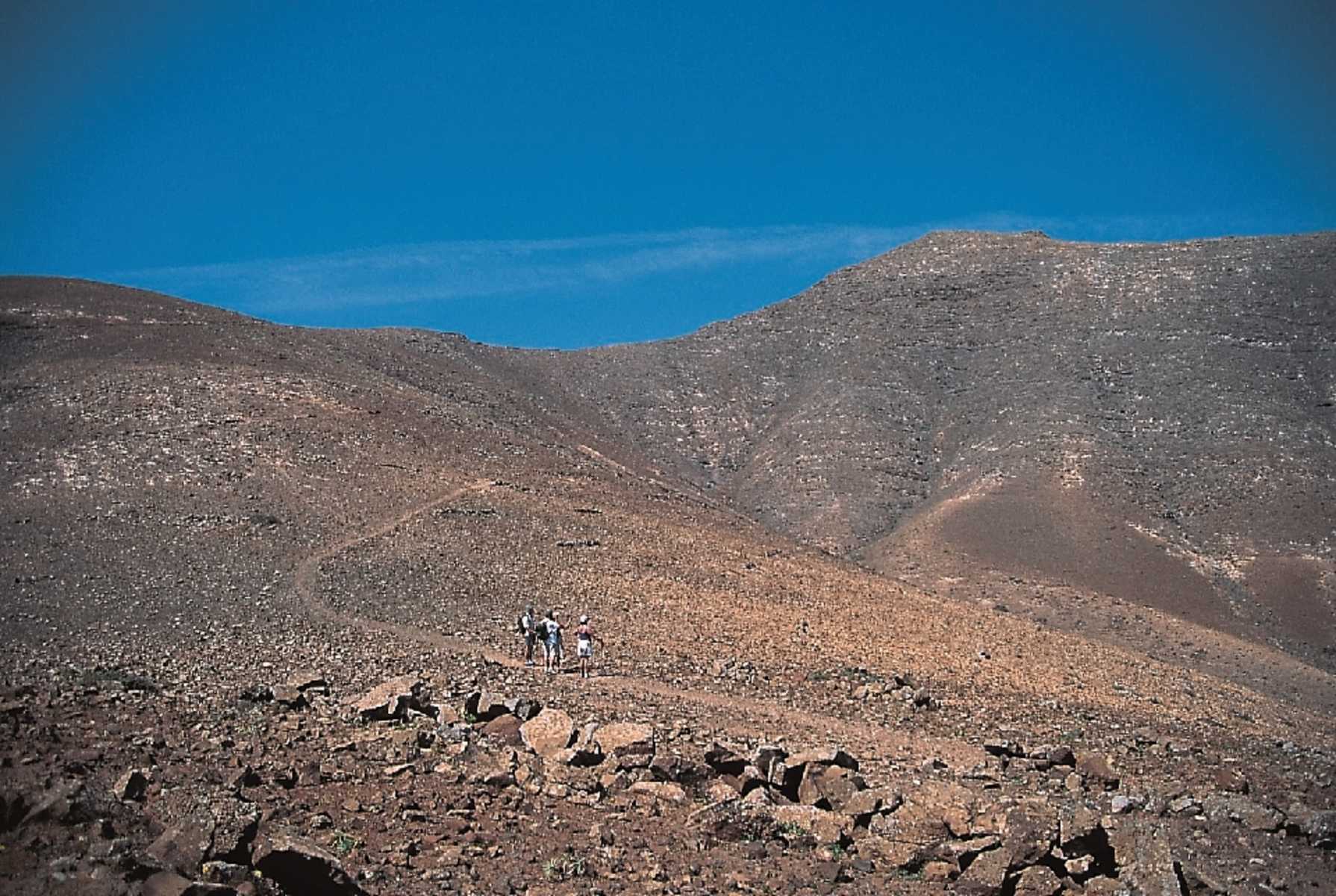 Wir wenden uns auf dem Rücken nach rechts in Richtung Degollada del Portugués (PR-LZ 09) und halten auf den wie eine Pyramide zugespitzten Bergkegel des Pico de la Aceituna zu. Etwa 30 m nach den Ställen wird ein großes Wasserreservoir passiert. Gleich nach diesem beginnt ein schöner Pfad (orange Punktmarkierung), der zunächst auf gleichbleibender Höhe den Talschluss des Valle de la Higuera umläuft. Dabei genießen wir die weite Aussicht auf Puerto Calero, Puerto del Carmen und Arrecife an der Ostküste.