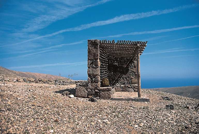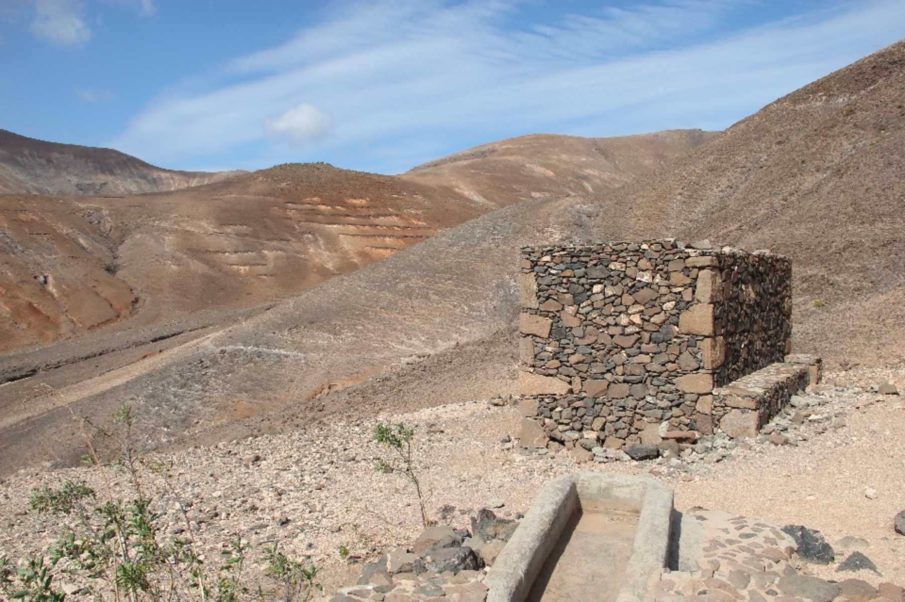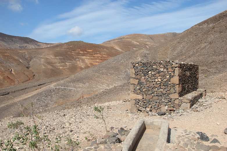 Mit Playa Blanca im Rücken und Puerto del Carmen vor uns läuft der Pfad nun im Zickzack den Rücken zwischen dem Valle de la Casa und dem Valle de los Dises hinab. Der Pfad steuert auf ein Steinmännchen auf einem Hügel zu, schwenkt jedoch kurz davor nach links in den Barranco de la Casita hinab. Wir queren das ausgewaschene Trockenbett und erreichen kurz darauf das Refugio del Aljibe, 240 m. Von dem Unterstand mit einer Zisterne daneben ergibt sich über den Barranco de la Casita hinweg ein schöner Ausblick auf die Hacha Grande.