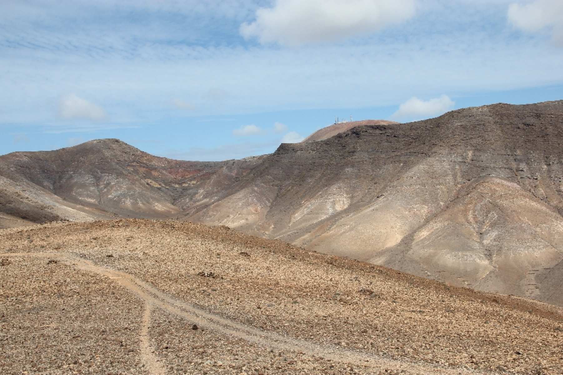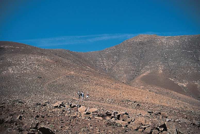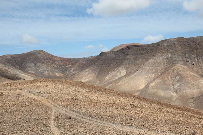 Der Pfad steigt gemächlich zu einer Einsattelung zwischen dem Pico de la Aceituna und dem Pico Redondo auf. Wir stehen nun am Südabfall der Ajaches-Berge und schauen auf die Ebene von Rubicón hinab, an deren Südrand sich die ausufernde Ferienstadt Playa Blanca breitgemacht hat. Rechts führt eine Trittspur in knapp 10 Minuten auf den aussichtsreichen Pico de la Aceituna, 487 m. Zurück im Sattel traversiert der weiterhin aussichtsreiche Saumpfad nun die Westflanke des Pico Redondo.