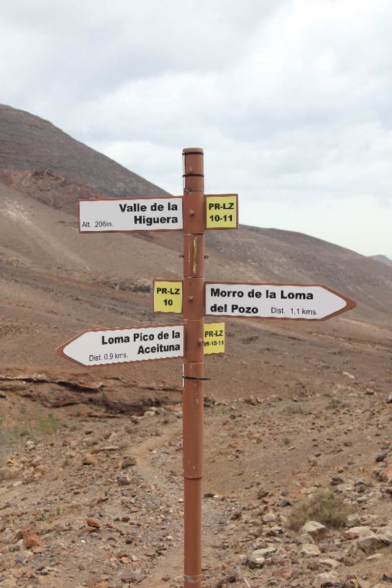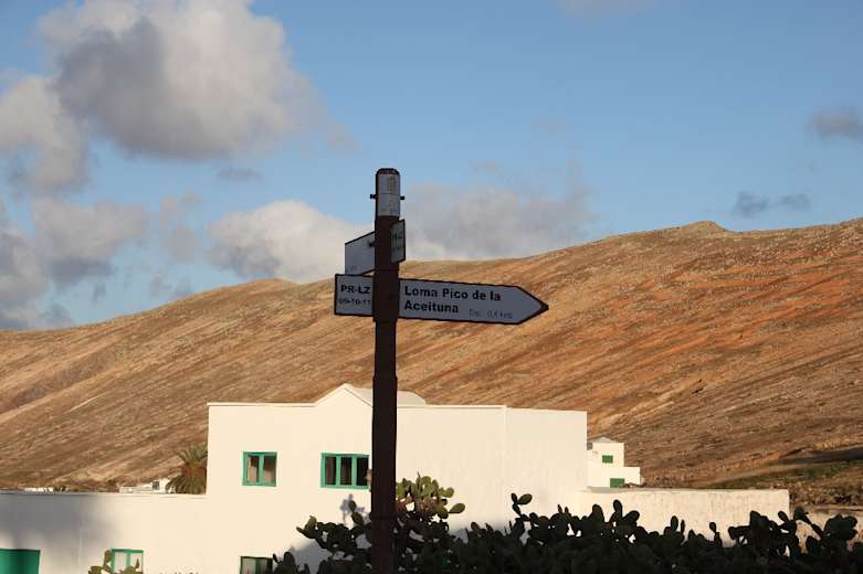 In Femés orientieren wir uns an dem Kreisverkehr bei der Bar Femés. Gegenüber von der Bushaltestelle am Kreisel gehen wir eine anfangs geteerte Piste in Richtung Loma Pico de Aceituna aufwärts (PR-LZ 09/10/11). Diese hält steil auf einen mit Flachbauten besetzten Bergrücken zu. Von der Wandertafel neben den lang gestreckten Stallungen auf der Loma Pico de la Aceituna, 404 m, führt geradeaus ein Pfad in das Valle de la Higuera hinab – von dort werden wir auf dem Rückweg wieder heraufkommen.
