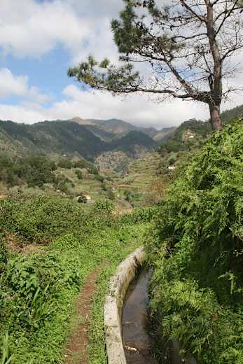 Am Levadaschild in Corujeira gehen wir die Stufen hinunter und dann auf einem breiten Betonweg knapp 20 m abwärts. An einem kleinen Wasserhaus biegen wir rechts in einen schmaleren Betonweg ein. Dieser läuft zunächst anderthalb Meter unterhalb des Wasserkanals entlang. Die schmale Levada Nova macht noch nicht allzu viel her, doch wir genießen bereits einen weiten Ausblick auf die dicht besiedelten Hänge des Tabua-Tals. Auf bald engem Pfad schwenkt die Levada nach Norden und gibt jetzt den Blick auf die Ribeira Tabua frei.