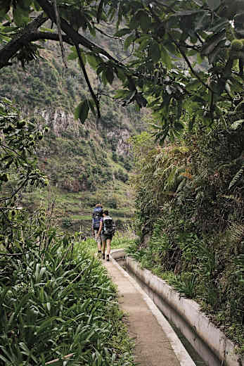 Man geht auf dem schmalen Levadamäuerchen. Gut 5 Minuten weiter läuft die hier abgedeckte Levada durch einen Felsdurchbruch, nach diesem kommen weitere stark ausgesetzte Stellen. Im Talschluss berührt die Levada den Weiler Sítio da Ribeira da Tabua. Wir queren die vom Talgrund heraufkommende Straße (rechts aufwärts kommt man in 5 Minuten zu einer Bar) und treffen sogleich auf den ersten von drei Zuläufen der Ribeira da Tabua, wobei es eine Furt zu durchwaten gilt (nach starken Regenfällen nicht einfach, kann jedoch ein Stückchen oberhalb auf einer Brücke umgangen werden).