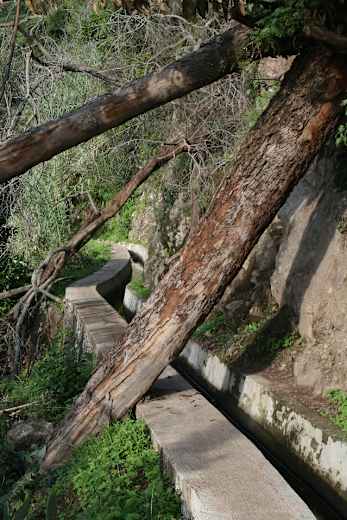 Auf der gegenüberliegenden Talseite können wir auf gleicher Höhe den Levadaweg ausmachen, auf dem wir in etwa anderthalb Stunden entlangwandern werden. Die ersten ausgesetzten Passagen lassen nicht lange auf sich warten. Nach einer Viertelstunde wird eine Straße gequert und kurz darauf ein 75 m langer Tunnel durchlaufen; an seinem Ende muss man etwas den Kopf einziehen. Danach schmiegt sich der Kanal eng an eine Felswand, zur Linken fällt der Hang steil ab, eine ausgesetzte Passage ist nicht gesichert.