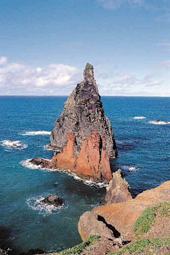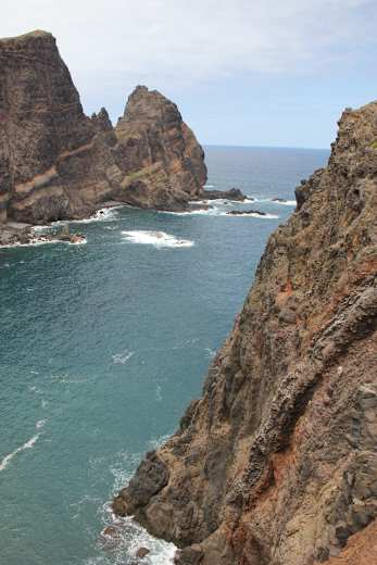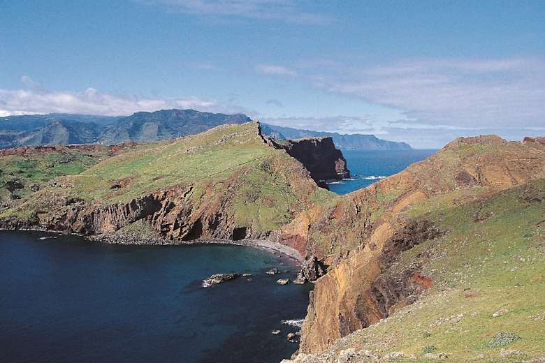 Spektakuläre Felsenküste im östlichsten Inselzipfel der portugiesischen Insel Madeira: Beim Landeanflug auf Madeira vermittelt die in der Einflugschneise gelegene Halbinsel einen Eindruck, der gar nicht so recht ins Klischee von der immergrünen Blumeninsel passen will.