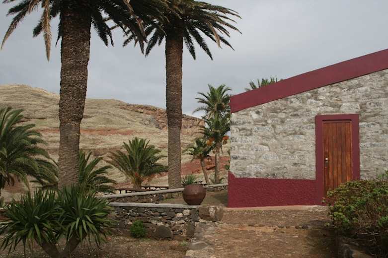 Der Pfad führt im weiten Bogen an der Südseite der Halbinsel um die Abra-Bucht herum. In Höhe der im Meer schwimmenden runden Fischzuchtanlage läuft der Weg über eine nur wenige Meter breite Landbrücke. Der Fels fällt zu beiden Seiten fast 100 m senkrecht ab – die engste Stelle der Halbinsel ist ebenfalls mit einem Zaun gesichert. Wir nähern uns der Casa do Sardinha, die von Dattelpalmen umringt wie eine Oase aus der rostrot bis currygelb eingefärbten Landschaft heraussticht.
