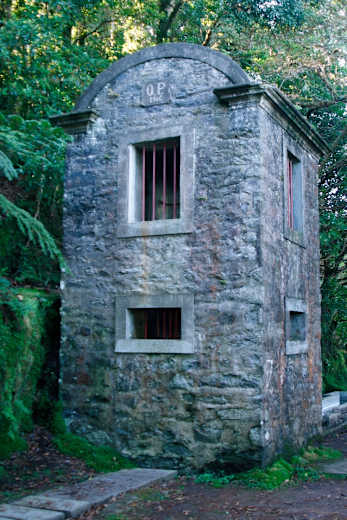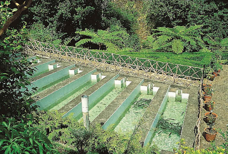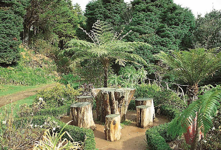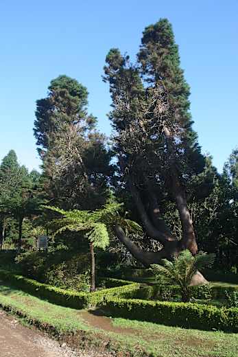 Ein paar Schritte nach dem Wasserhaus Lamaceiros, es gibt hier zwei Picknicktische, treffen wir auf eine ausgeschilderte Kreuzung. Wir verlassen hier die Levada und folgen dem breiten Weg scharf links bergab in Richtung Portela. Schon bald begleitet uns wieder ein schmaler Kanal. Am Forsthaus Lamaceiros, 780 m, lädt unter prächtigen Nadelbäumen und Baumfarnen eine Picknickzone zur Rast ein. Das Forsthaus wird links liegen gelassen. Wir folgen einem breiten Forstweg, an einer Gabelung nach 200 m gehen wir links und genießen kurz darauf den Ausblick auf den Adlerfelsen.