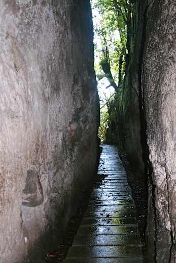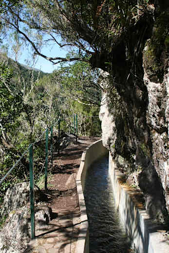 Weitere kleinere Wasserfälle rauschen herab. In einer scharfen Rechtskehre führt links ein Pfad auf einen Felssporn, von dem sich nochmals der Blick auf die Berge öffnet. Wenige Minuten danach wird eine an die 20 m hohe Felsspalte erreicht, die an ihrem Ende von einem kurzen Tunnel durchstochen wird. Am Cabeço Furado beginnt nun das spektakulärste Wegstück. Die Levada ist hier in die Wand gebaut und durchläuft sieben weitere kurze Tunnel von maximal fünf bis sechs Metern Länge.