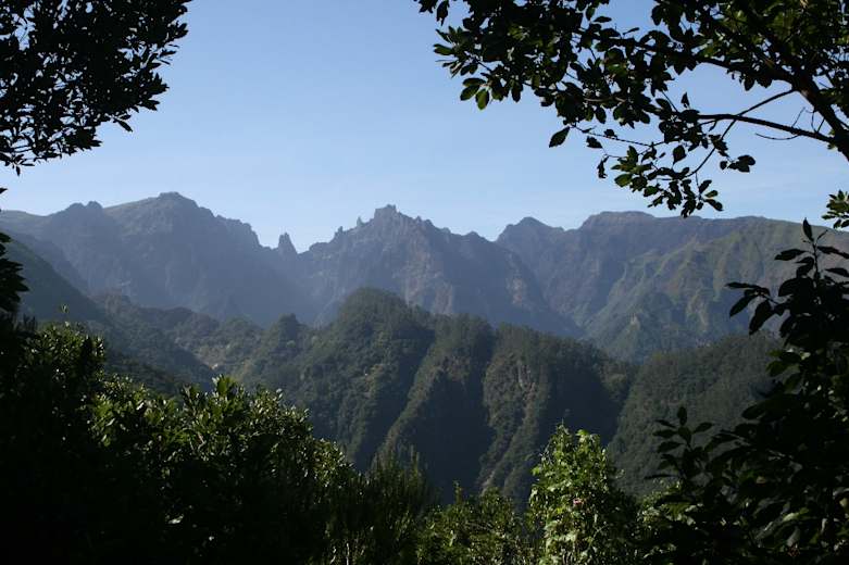 In Ribeiro Frio gehen wir am Restaurant Ribeiro Frio ein paar Schritte die Straße abwärts, biegen am Wegweiser „PR 10 Portela" rechts ab und queren auf einer Brücke den „Kalten Fluss". Wir folgen dem breiten Weg am rechten Flussufer, sogleich taucht die Levada do Furado neben uns auf. Lorbeer und Baumheide bilden ein dichtes Kronendach, je nach Jahreszeit stürzen Rinnsale vom Hang. Nach 25 Minuten lichtet sich der grüne Dschungel und gibt die Aussicht auf die höchsten Gipfel Madeiras frei – immer vorausgesetzt, das zentrale Bergland versteckt sich nicht in einer Nebelbank.