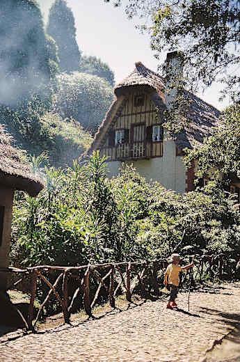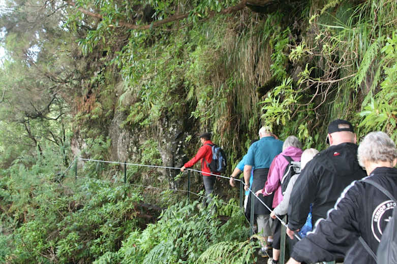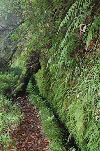 Vom Parkplatz in Queimadas gehen wir an der strohgedeckten Casa do Abrigo vorbei zum Ententeich. Hinter der Holzbrücke weist ein Schild (PR 9 Caldeirão Verde) die Richtung. Der zunächst breite Weg entlang der Levada do Caldeirão Verde wird bald schmaler. Bis zu 100 m abfallende Stellen werden nicht als schwindelerregend empfunden, da dichter Bewuchs am Wegrand den Abgrund mildert. Bald haben wir einen Blick zur Nordküste hinunter, tief unten im Tal liegt idyllisch auf einem Plateau der Weiler Ilha.
