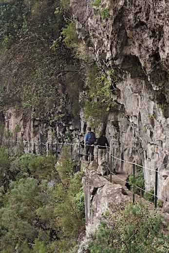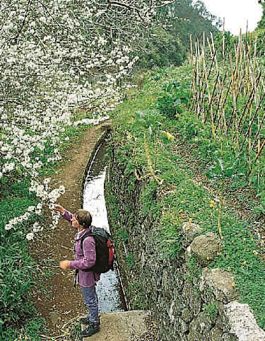An einer unpassierbaren Engstelle wird die Levada rechts auf einem Steig umgangen. Die Levada läuft dann in das Tal der Ribeira dos Cedros hinein, der Kanal wird hier auf einer Bogenbrücke elegant über das Schluchtbett geführt. Wir stoßen auf einen Wasserfall, der sich aus 50 m Höhe in die Levada ergießt. Vor dem Wasserfall können wir das Bachbett bequem queren. Es kommen nun einige schwindelerregende Stellen, die mit Drahtzäunen gesichert sind.