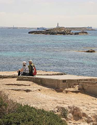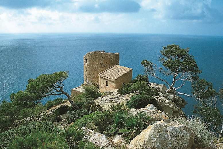 Den Steinmännchen folgend geht es jetzt immer geradeaus. Durch die Kiefern wird der Blick auf Dragonera frei, zum Greifen nahe liegt die Dracheninsel mit ihren drei Leuchttürmen vor uns. Schon bald taucht auch die Torre Cala en Basset auf. Der Wachturm thront einsam auf einer Felszunge, wir genießen von hier eine herrliche Aussicht hinunter auf die verschwiegene Cala en Basset und hinüber auf die Dracheninsel.