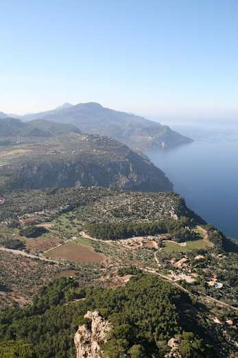 In nordöstlicher Richtung wird bereits das nächste Etappenziel sichtbar: der Gipfel der Talaia Vella (868 m), auf der eine 2011 restaurierte Schutzhütte aus der Zeit des Erzherzogs steht. Nach Nordosten schauen wir über die steile Felswand des Caragolí (zu der wir im weiteren Wegverlauf aufsteigen werden) auf die beiden höchsten Berge Mallorcas, den Puig Major und rechts davon auf die Massanella.