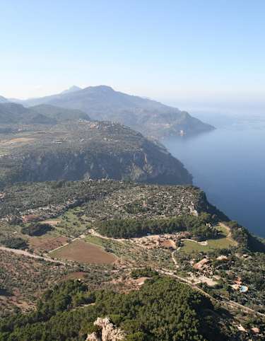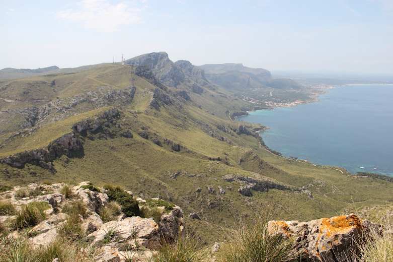 Das Sträßchen schwenkt von dort auf die bald in Sicht kommenden Sendemasten auf dem Sa Tudossa. 3 Minuten nach dem zur Küste abzweigenden Camí des Esquena steigen wir an der Gabelung links zum Puig de sa Tudossa (442 m) auf. Von dem zwar nicht gerade heimeligen Antennenwald auf dem Gipfel ergibt sich ein fulminantes Panorama der weit geschwungenen Buchten von Alcúdia und Pollença und der sich dahinter aufbauenden Silhouette der Tramuntana.