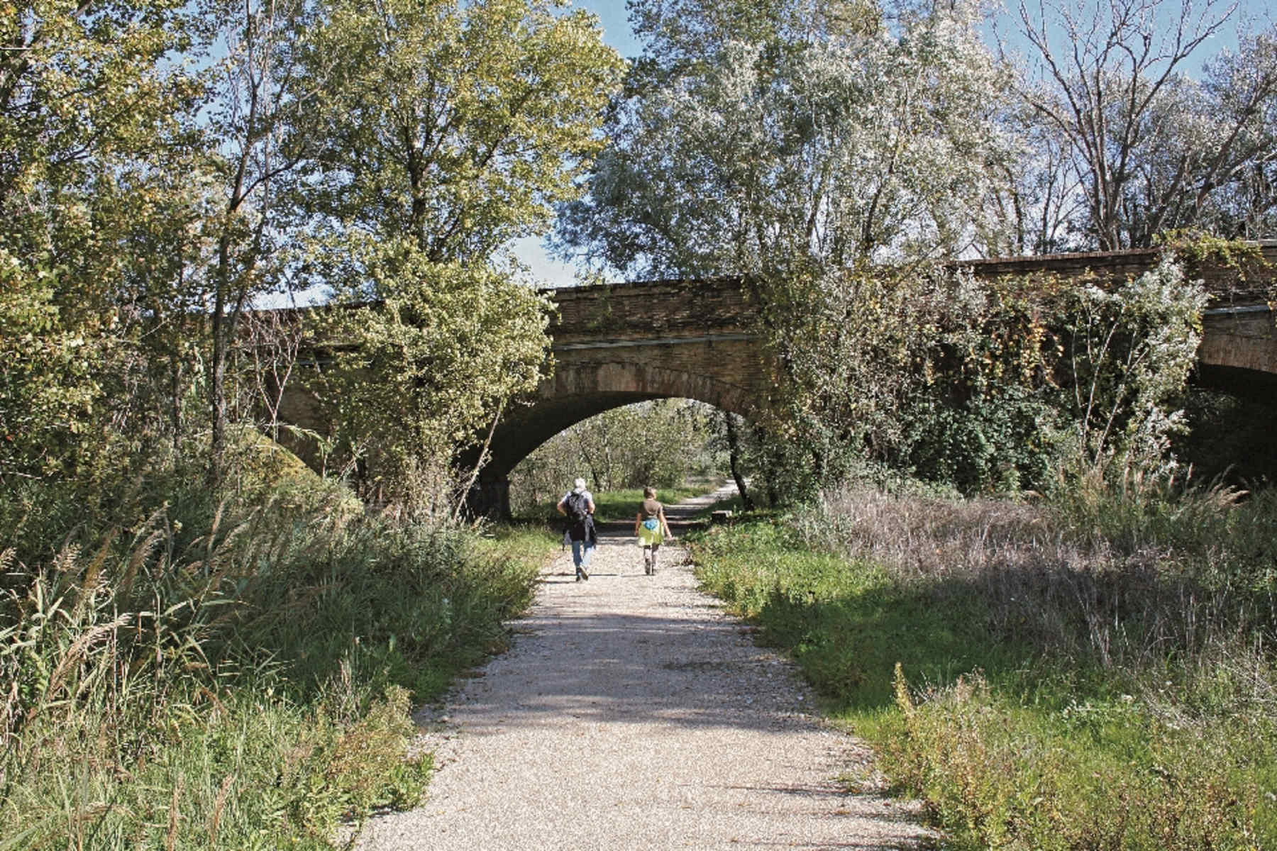 Wir beginnen die Wanderung in Cattolica bei der Brücke über die Conca, etwa 300 m westlich der Piazza delle Nazioni. Der breite Sandweg führt links von der Brücke zum Fluss und dann auf der Deichkrone flussaufwärts nach links. Vor einer gemauerten Straßenbrücke nach knapp 10 Min. verlässt der Weg die Deichkrone, wir gehen in einer S-Kurve nach rechts hinunter zum Fluss und dann unter der gemauerten Brücke und der kurz darauffolgenden zweiten Straßenbrücke hindurch.