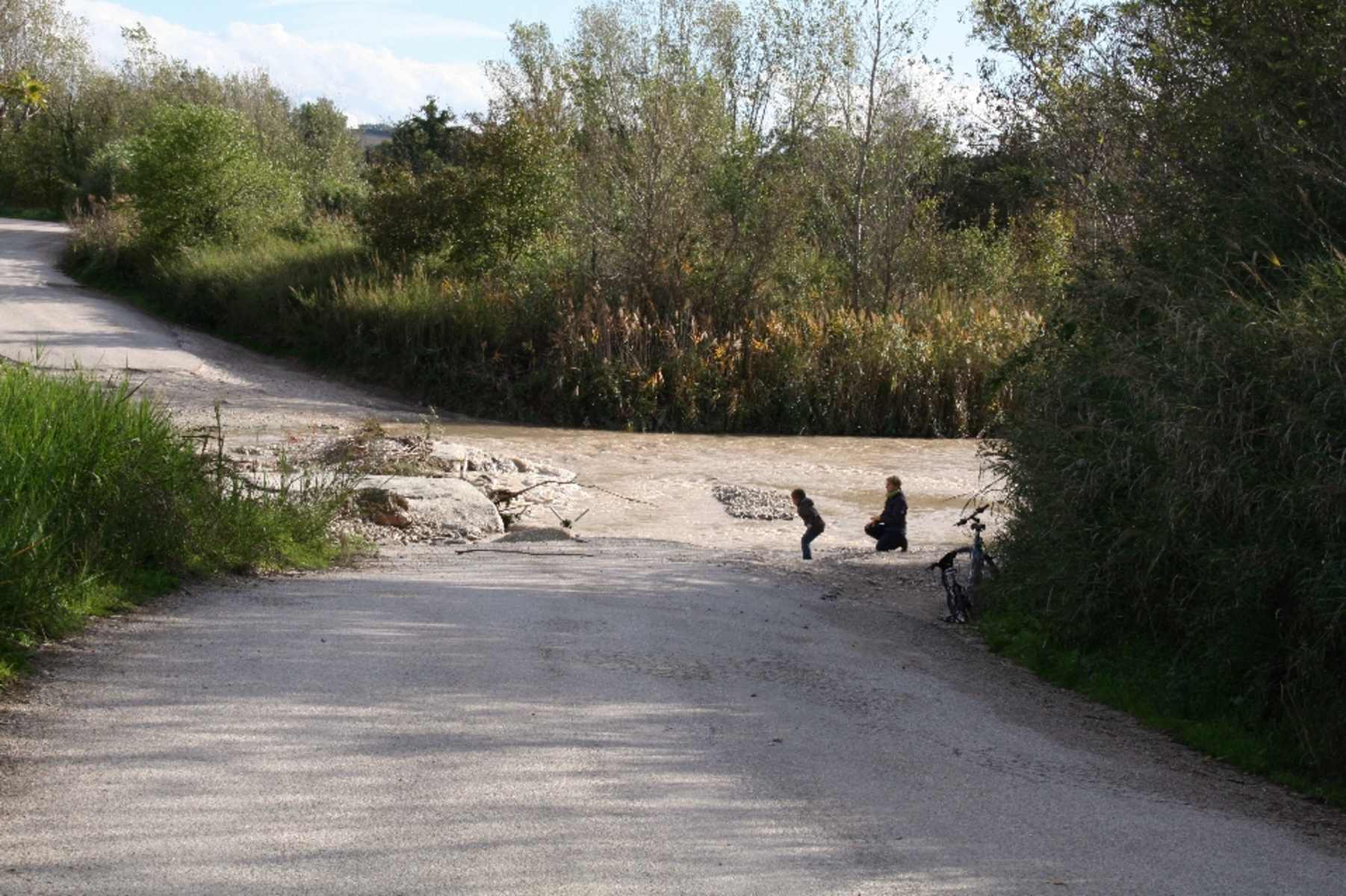 40 Min. nach dem Clubhaus sehen wir links ein Schloss und 10 Min. später ein Rohr, das über die Conca führt. Nach weiteren 5 Min. biegen wir nach rechts in eine Landstraße. Die Überquerung der Conca war im Herbst 2012 nach Regenfällen nur mit hochgekrempelten Hosen möglich. Auf der anderen Flussseite gehen wir dann nach wenigen Metern direkt vor dem Ortsschild S. Clemente nach rechts und umgehen eine rot-weiße Schranke.