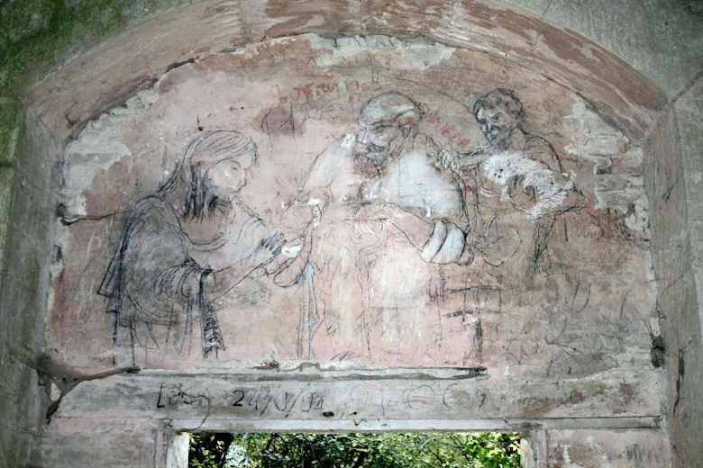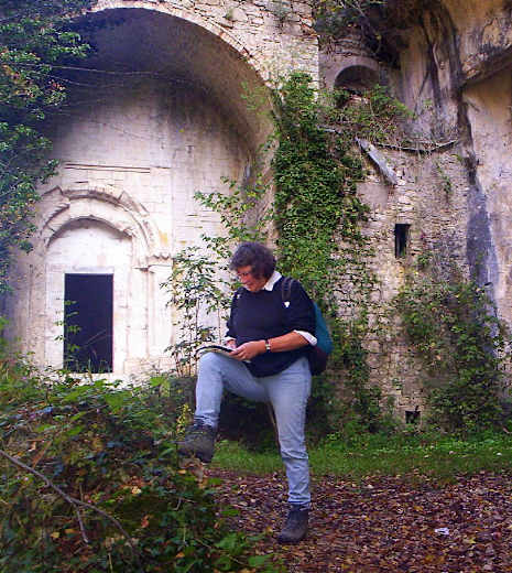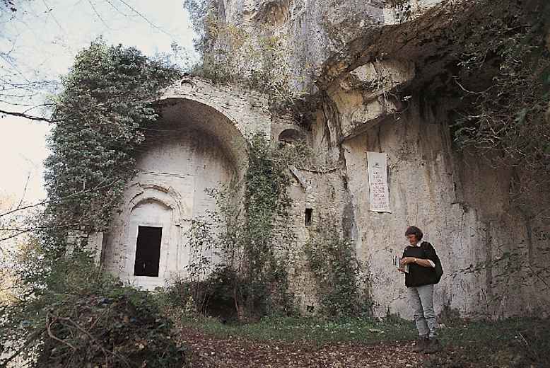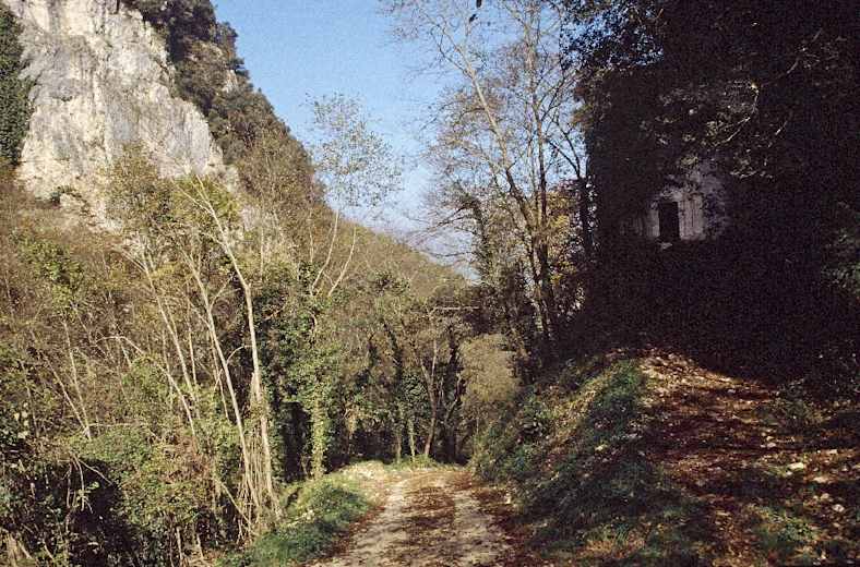 20 Min. später wird das Tal enger und der Bach fließt direkt neben der Straße; kurz danach kommen wir zur Kirche des heiligen Eustachio, die nahe einer großen Grotte an der Felswand klebt. Früher lebten in dem Tal Mönche und Einsiedler; heute haben Vandalen das Gotteshaus besprayt und sein Portal zerstört. Von hier führt ein Pfad im engen Tal geradeaus weiter, kreuzt das Bachbett und mehrere Zuflüsse und gabelt sich nach 10 Min. Hier links und am tiefer liegenden Bachbett entlang, der Pfad fällt etwas ab und überquert dann das Bachbett.