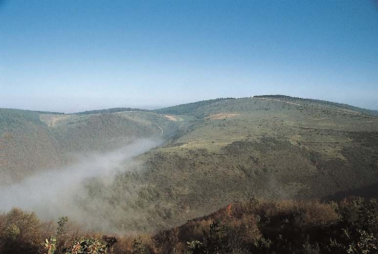 Der Monte d’Aria (956 m), an dessen Osthang der Weg bis auf 815 m Höhe ansteigt, ist leicht am steinernen Antennenturm auf seiner Kuppe erkennbar. Links liegt die halbseitig kahle Kuppe des Monte di Colleluce (860 m, kleine Antennenanlage) und zwischen den beiden Bergen das Cerreto-Tal. ½ Std. nach dem zweiten Drahtzaun erreichen wir die Chiesa di Madonna del Monte auf dem Grat zwischen den beiden Gipfeln.