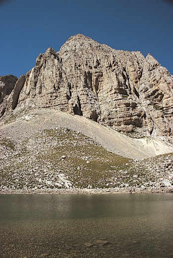 Auf dem weichen Boden bequem hinab, sich dabei leicht links haltend, und in 20 Min. zu einem von zwei Grasböschungen flankierten Einschnitt. Dahinter sieht man unten in der Talsohle den Lago di Pilato, je nach Jahreszeit einen größeren oder zwei kleinere Seen. Der fallende, gerade Pfad verläuft nach Norden an der Stein- und Geröllflanke des Monte Vettore entlang und ist großteils einfach zu begehen; an ein oder zwei Stellen muss man die Hände zu Hilfe nehmen. Gegenüber liegen der Pizzo del Diavolo, 2.410 m, und die Cima del Redentore, 2.448 m. Von dem Moment, in dem man den Lago di Pilato, 1.940 m, sieht, bis zum Erreichen seines entfernteren Endes vergehen 20 Min.