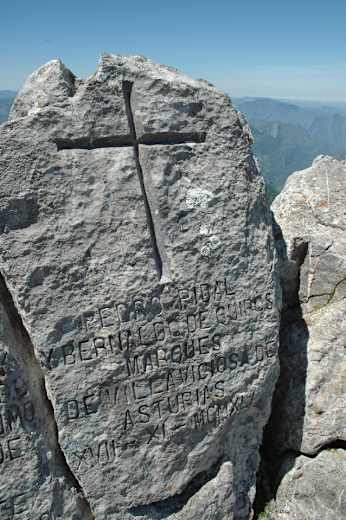 Hier wenden wir uns nach rechts und gehen auf dem leicht ansteigenden, teils undeutlichen, aber markierten Pfad zum Mirador de Ordiales (1.764 m). Wie eine große Steinstufe ist das Grab Pedro Pidals in den Fels gebaut, darin eingelassen die steinerne Grabplatte mit der oben zitierten Inschrift. Auf der anderen Seite fällt der Fels senkrecht ins Tal des Río Dobra ab. Gegenüber erhebt sich der Cantu Cabroneru (2.000 m). Dahinter zeichnen sich die Gipfel des Naturparks Ponga ab, im Nordwesten, an der Küste, erstreckt sich die Sierra del Sueve, daneben an klaren Tagen das blaue Band des Atlantiks. Es wundert nicht, dass Pedro Pidal diesen ergreifenden Ort zur letzten Ruhestätte wählte.